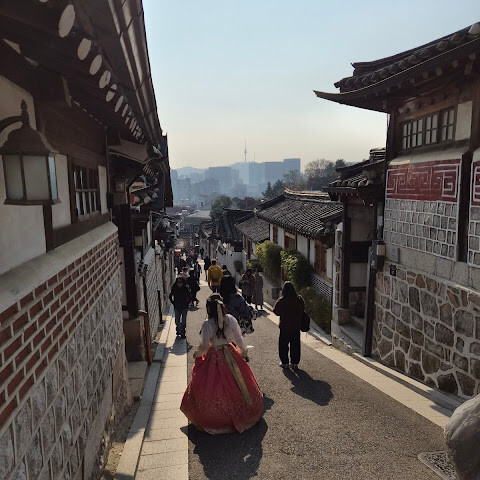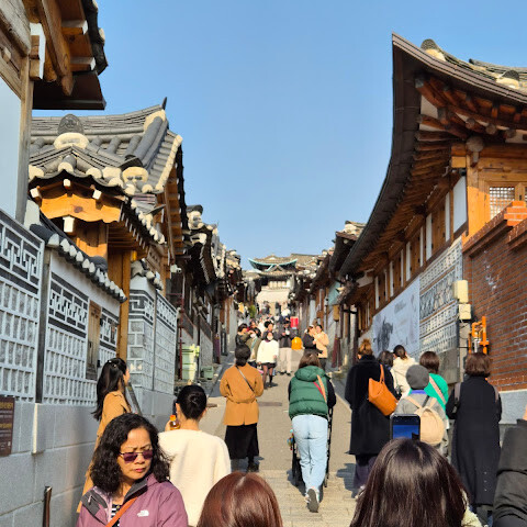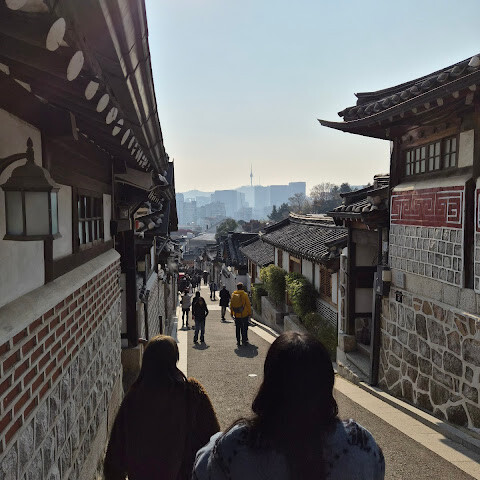 꼭 한번 방문할 만한 곳이에요! 아름다운 건축물들이 많고, 번화하고 현대적인 서울 도심 속에 역사적인 건물들이 어우러져 있는 모습이 정말 멋졌어요. 마을을 걸어 다닐 때는 꽤 쌀쌀했지만, 그래도 정말 좋았습니다. 사람이 좀 많아서 완벽한 사진을 찍으려면 사람들 사이를 헤쳐 나가야 할 때도 있어요. 저희는 기회가 없었는데, 마을에 있는 아기자기한 가게들과 카페들도 구경해 보고 싶었어요.