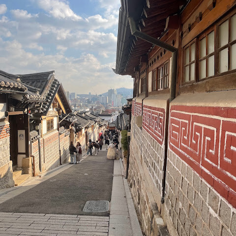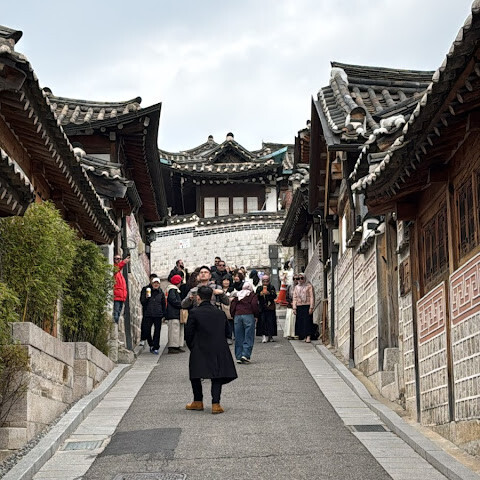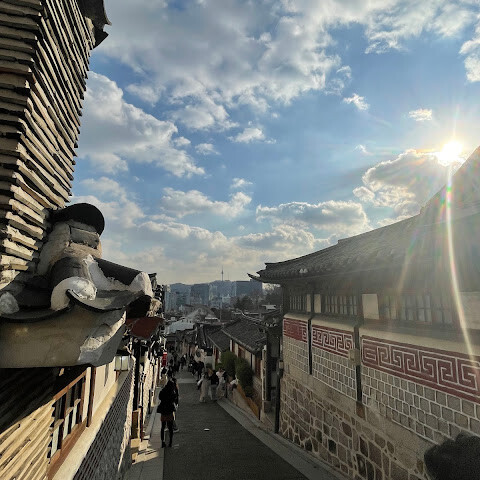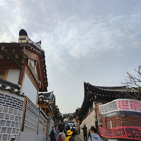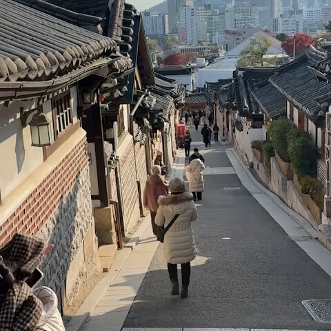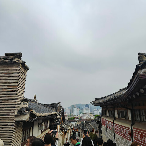 꼭 한번 방문해 볼 만한 곳이에요! 아름다운 건축물들이 많고, 번화하고 현대적인 서울 도심 속에 역사적인 건물들이 어우러져 있는 모습이 정말 멋졌어요. 마을을 걸어 다닐 때는 꽤 쌀쌀했지만, 그래도 정말 좋았습니다. 사람이 좀 많아서 완벽한 사진을 찍으려면 사람들 사이를 헤쳐 나가야 할 정도였어요. 아쉽게도 저희는 기회가 없었지만, 마을에 있는 아기자기한 가게들과 카페들도 구경해 보고 싶었어요.