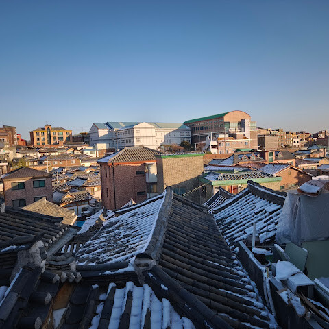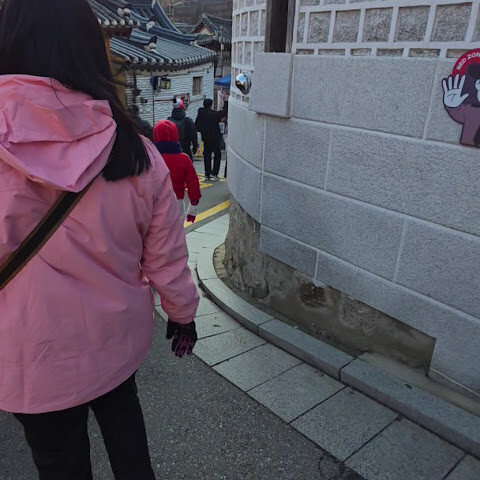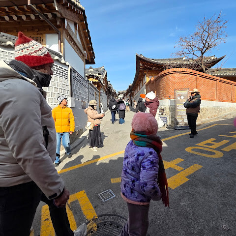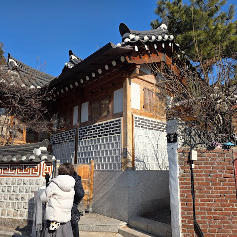 북촌 한옥마을은 경복궁과 함께 당일치기 여행으로 다녀오기 좋습니다. 버스를 타면 북촌로 바로 앞에 정차하는데, 거기서 지도를 보고 도보 코스를 계획할 수 있습니다. 마을은 언덕에 자리 잡고 있어 약간의 오르막길을 올라야 하지만, 골목길을 따라 걷다 보면 전통 한옥들이 모여 있는 모습과 지붕에서 내려다보이는 풍경, 그리고 경복궁이 살짝 보이는 절경을 감상할 수 있습니다. 테라스가 있는 아늑한 카페에서 잠시 쉬어가기도 합니다. 마을을 둘러보고 사진 명소를 찾으려면 최소 2시간은 잡는 것이 좋습니다. 북촌 한옥마을은 주거 지역으로 오전 10시부터 오후 5시까지만 출입이 제한되므로 사진 촬영 시 주변을 배려해 주시기 바랍니다. 저희는 1월 초 정오쯤 방문했는데, 온라인 사진에서 본 것보다 한옥이 몇 채밖에 보이지 않아 아쉬웠지만, 마을의 분위기와 아름다운 풍경을 즐기기에 충분히 가볼 만한 곳입니다.