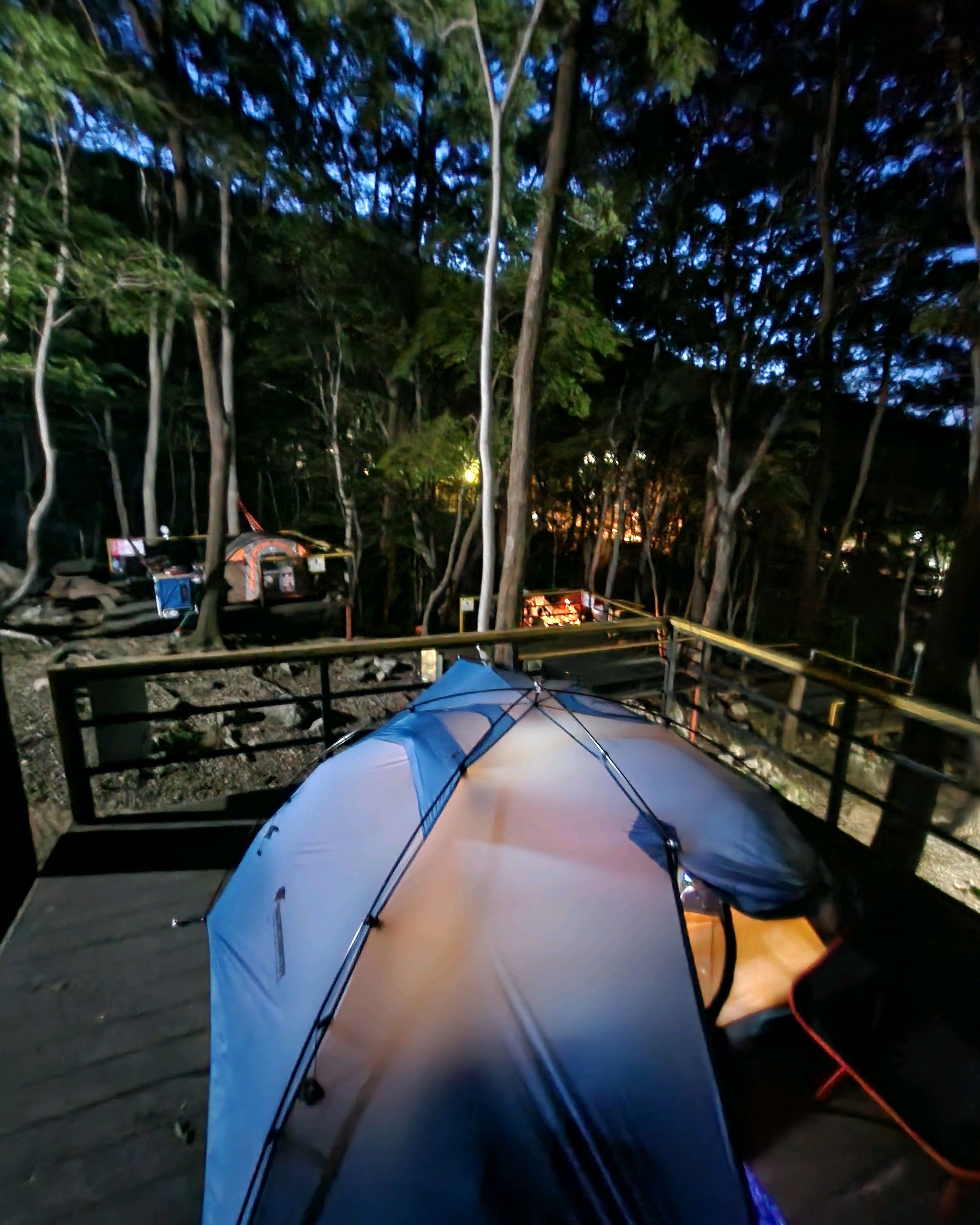혼자 텐트를 치는 것은 처음이라 마음이 설레었고, 해보니 그늘 나무 아래의 맑은 공기가 참 좋았습니다. 조용하고 편안한 분위기 속에서 여유로운 시간을 잘 보낼 수 있었고, 덕분에 편안하게 잠들 수 있었습니다. 깔끔한 분위기가 정말 최고였습니다.^^