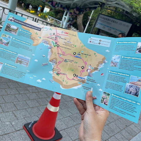 그날 태종대에 갔을 때 날씨가 썩 좋지 않았어요. 안개가 자욱하고 구름이 낮게 깔려 시야가 좋지 않았죠. 6월 중순이라 수국이 아직 만개하지 않아서 간헐적으로 몇 송이만 피어 있는 게 아쉬웠어요. 그래도 길가에 수국을 심어놓은 분들이 계셔서 아름다운 꽃들을 볼 수 있었어요. 정말 행복했어요! 태종대에 가서 케이블카 티켓을 사러 걸어 올라가세요 (원하는 곳까지 케이블카를 타고 갈 수 있어요). 물론, 급하지 않고 걷는 걸 좋아한다면 티켓을 살 필요는 없어요. (관광지를 더 쉽게 이해하기 위해 안내 지도를 지참하는 것을 추천합니다.)