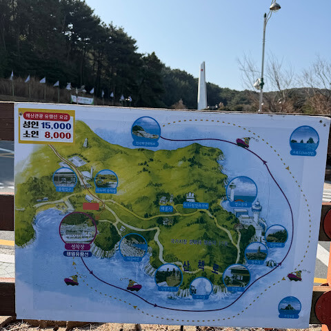 섬 주변을 도는 유람선을 파는 업체들이 많은데 가격은 15,000원입니다.