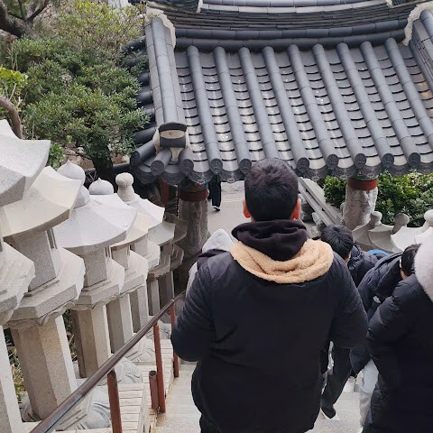 식당으로 가던 중 길을 잘못 들어 우연히 발견한 놀라운 곳이었어요. 처음에는 잠깐 들른 곳이라고 생각했는데, 그날의 하이라이트 중 하나가 되었죠. 사찰 자체는 아름다웠고, 평화롭고 잘 정돈되어 있었으며, 놀라울 정도로 조용했어요. 특히 영하 8도 정도의 추운 날씨 덕분에 사람이 거의 없어서 더욱 특별한 느낌이었어요.