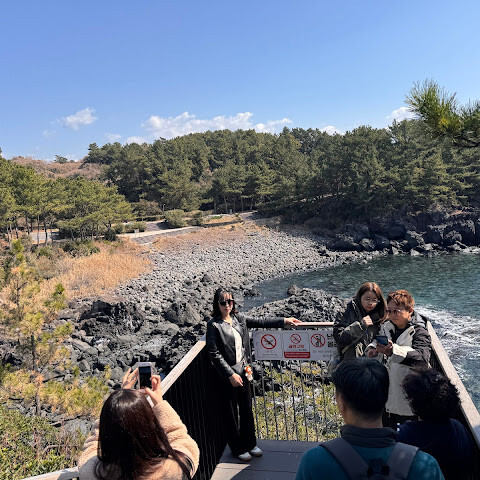 정방폭포보다 이곳을 더 추천합니다. 곳곳에 전망대가 잘 조성되어 있어 누구나 번갈아 가며 사진을 찍을 수 있습니다. 17시 40분에 수문이 닫히고, 17시 20분에 마지막 입장이 가능하다는 점 꼭 기억하세요. 이곳에서 일몰 사진을 찍을 수 있는데, 정말 만족스러워요!