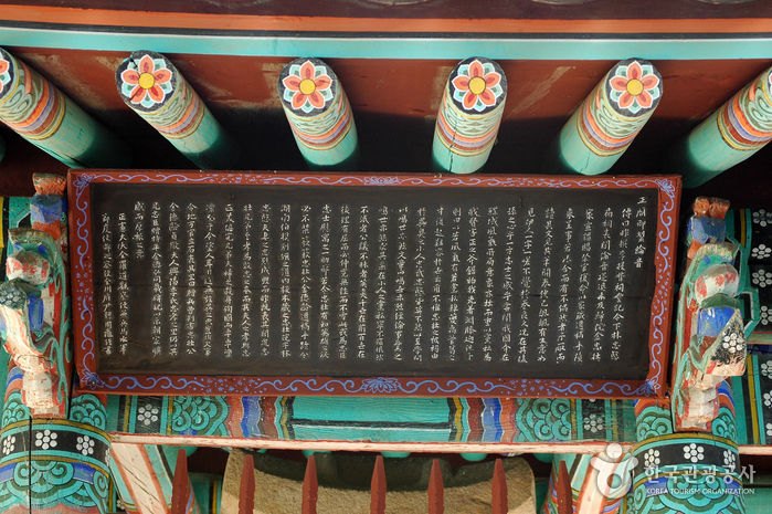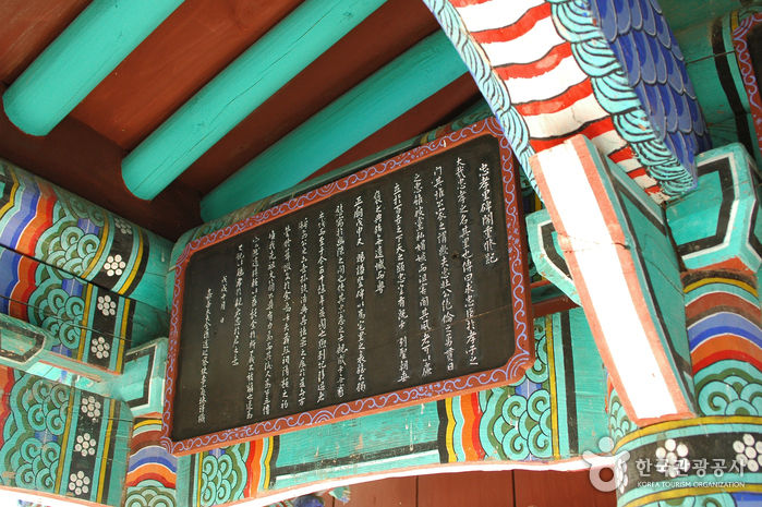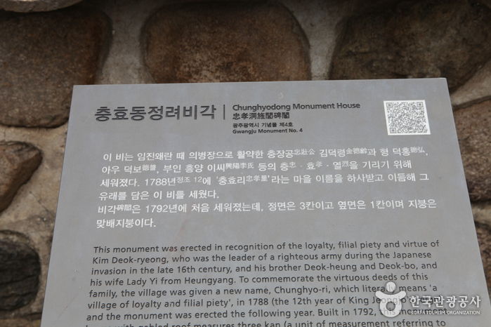 충장공 김덕령(1568~1596) 장군과 그의 부인 흥양 이 씨, 그 형 덕홍과 동생 덕진 일가족의 충·효·열을 기리기 위해 충효리 마을 앞에 세운 비각이다. 이것이 여느 문과 다른 것은 이 비각 앞의 현판에 새겨 있는 내용에서 “... 1788년 정조가 윤음으로서, 표리비를 세우라” 이르고, 충효 지리[忠孝之里]라는 마을 이름을 지어 하사한 점이다. 비는 1789년(정조 13년)에 세운 것으로 전면에는 비명이 3행으로 새겨져 있다. 비의 크기는 총 높이 220Cm, 기단 높이 110Cm, 비신 높이 171Cm, 비신 너비 68cm이며 비갓이 얹혀 있다. 비각은 정면 3칸, 측면 1칸의 맞배지붕이며 삼문과 담장으로 둘러져 있다. 비각의 건립 연대는 1792년이며, 그 뒤 수차례의 중수를 거쳤다. 비각 전면에는 전주 부윤 한용구가 쓴 정조어제윤음[正祖御製倫音]이란 현판이 있다.