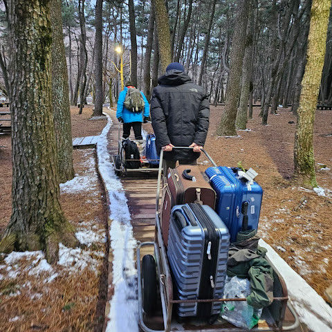 입구에서 숙소까지 손수레를 끌고가야함. 바닥이 미끄러우면 조심해야함. 8인실에 화장실이 하나 밖에 없어서 4명 이상 숙박시 불편함