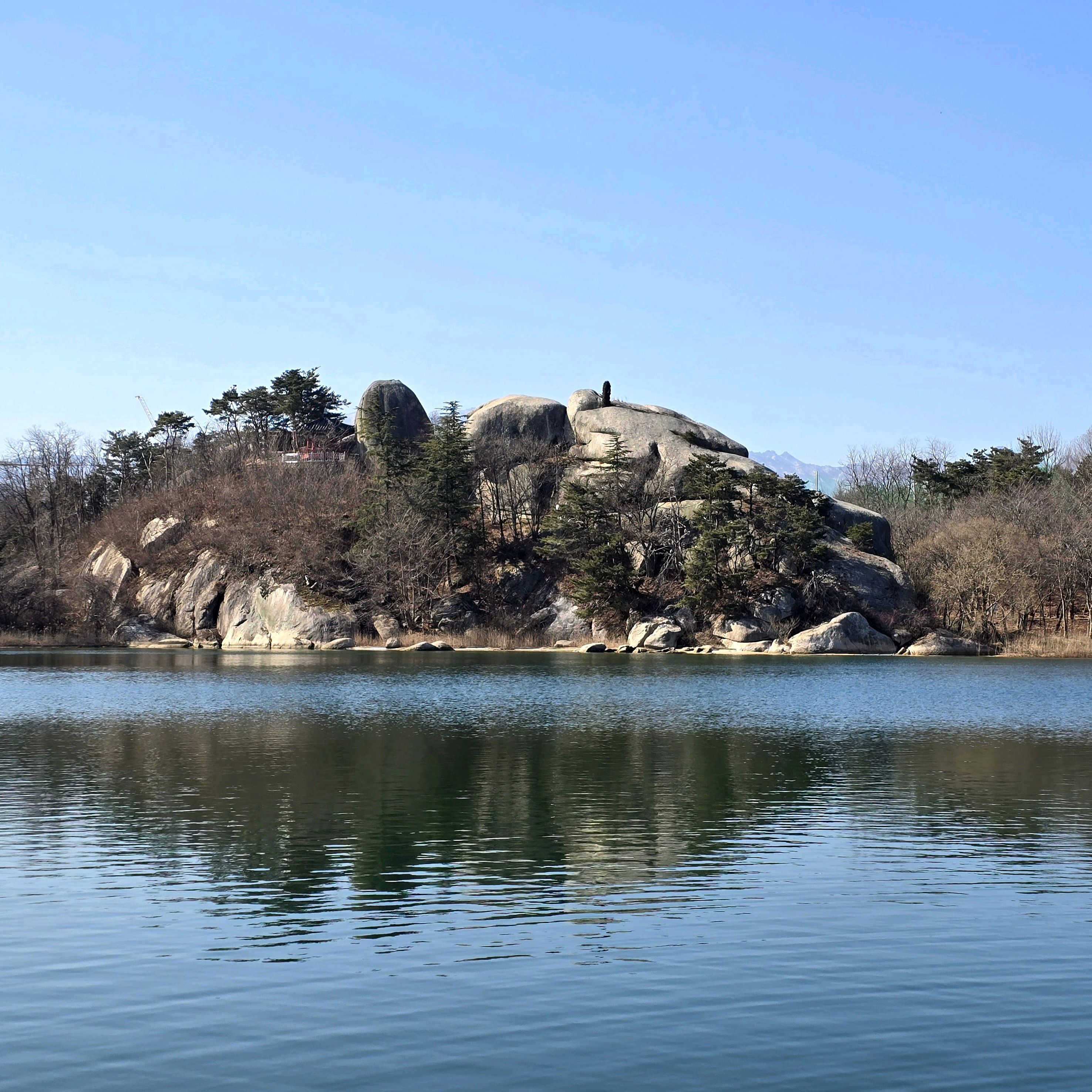 맑고 잔잔한 호수에 비친 웅크리고 앉아 있는 범바위가