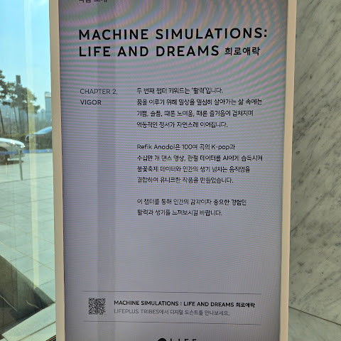 슈발 Refik Anadol 전시 보려고 비행기타고 택시타고 왔는데 스크린 열화로 인해서 퀄리티가 많이 떨어짐. MOMA에서 봤던 퀄리티를 기대했으나 너무나도 아쉬움. 왜 이걸 해가 쨍 비추는곳에 놨고, 관리를 안했을까 의문임. 하....