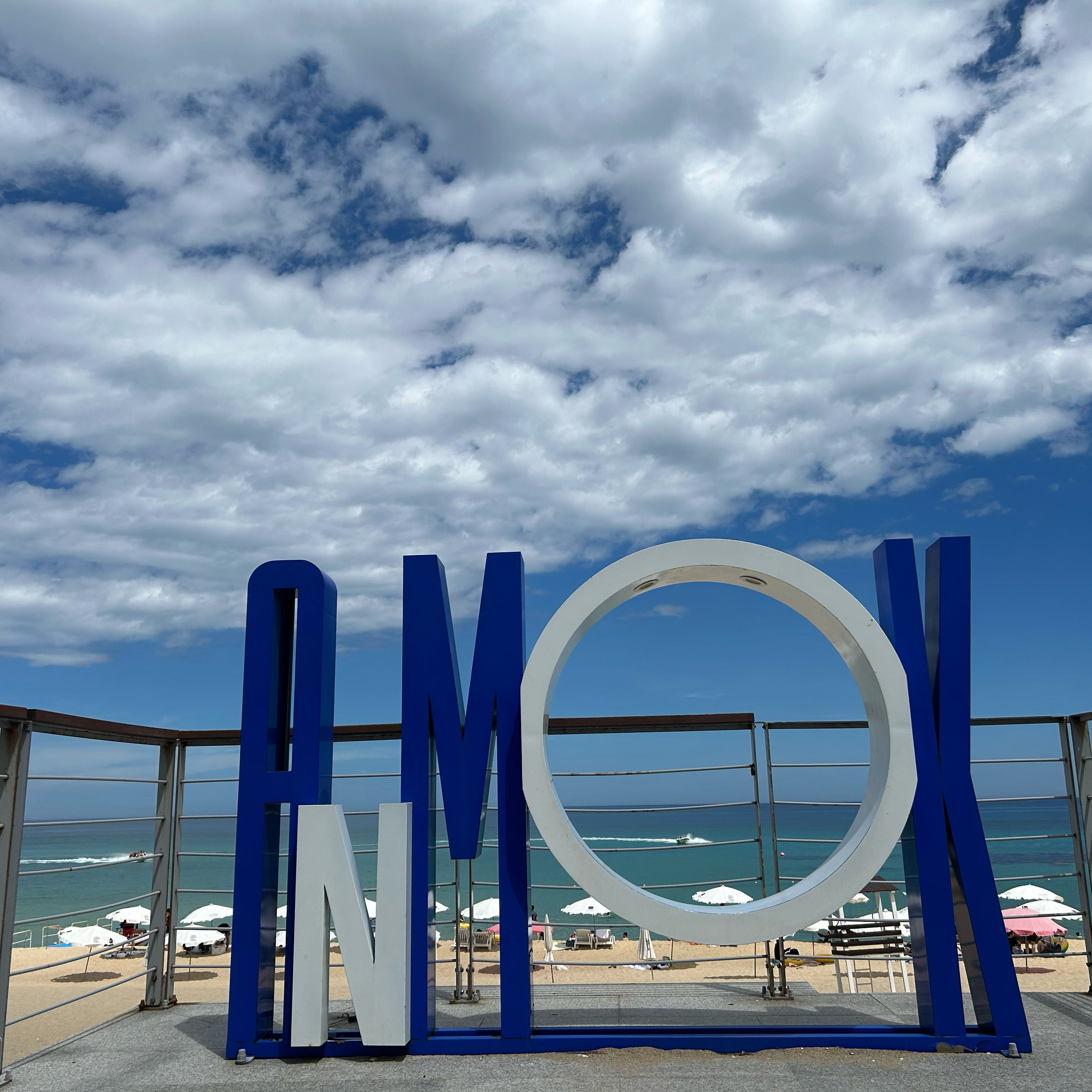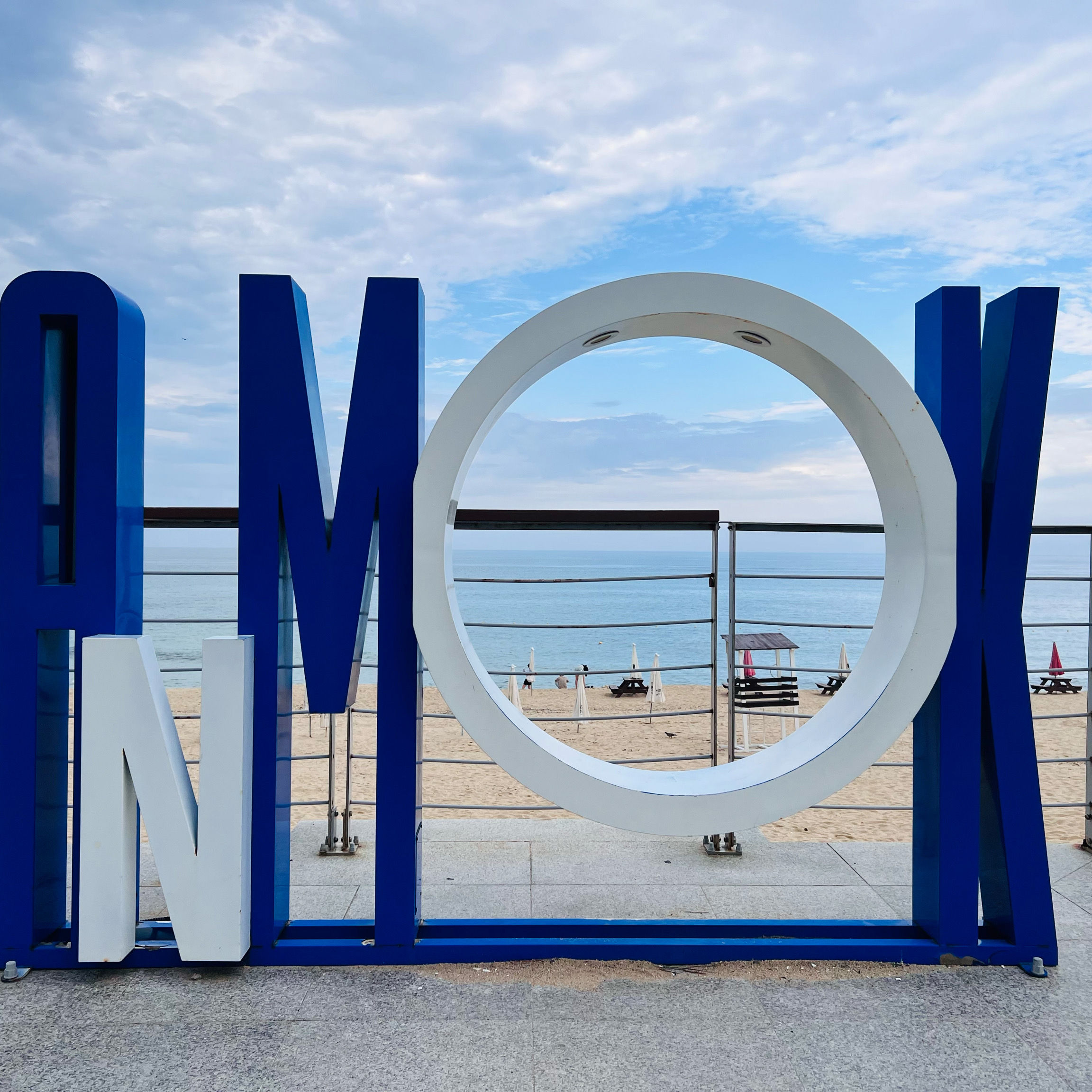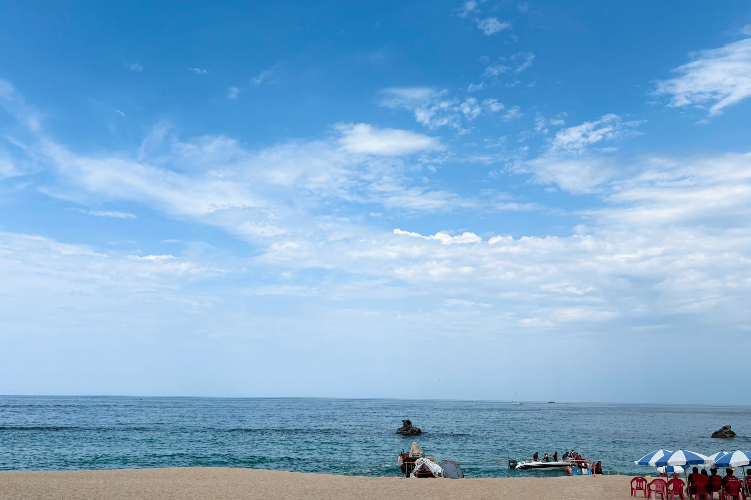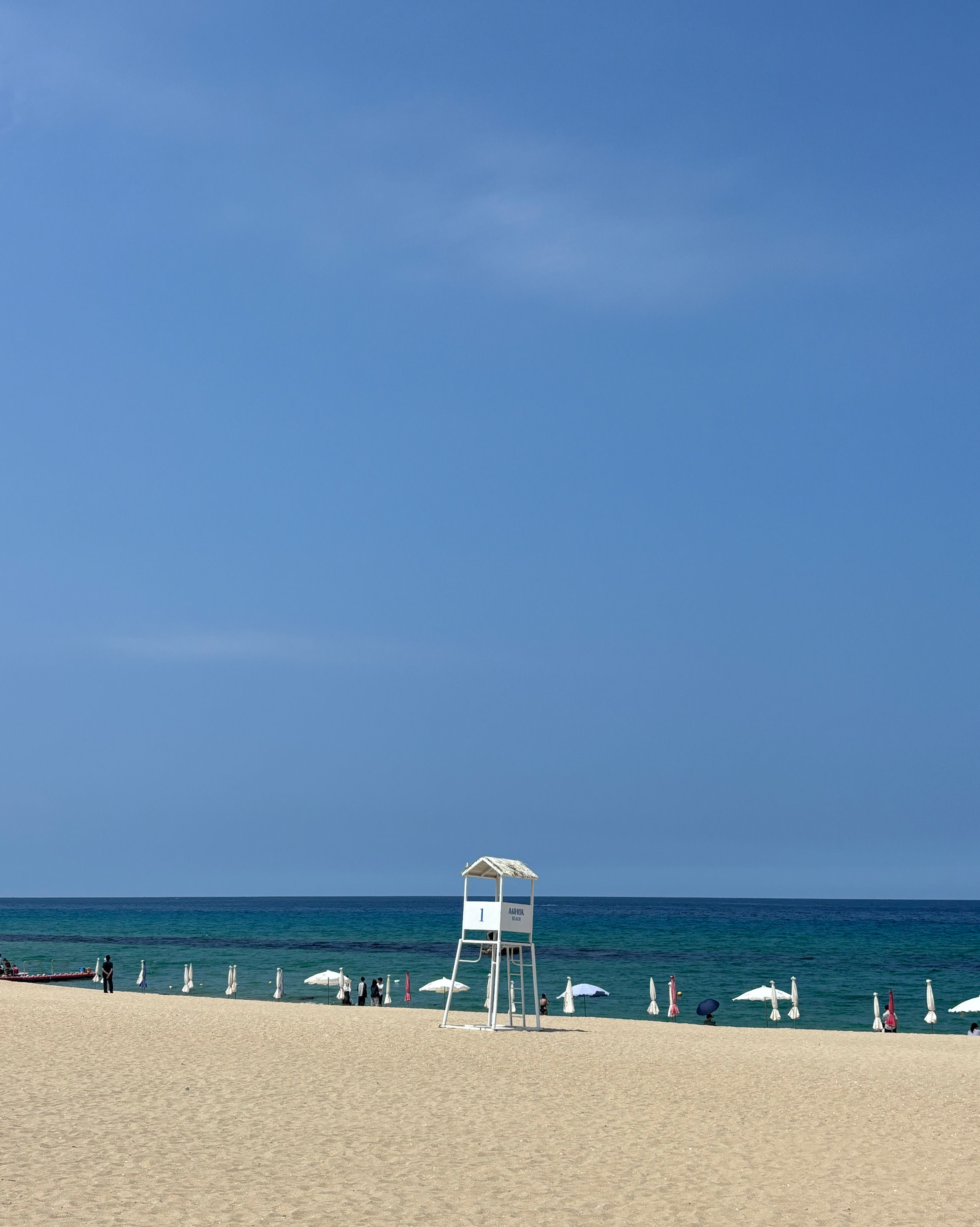 드디어 여름 휴가! 💙 푸른 하늘과 맑은 바다가 함께하는 안목해변이다. 강렬한 햇살 아래, 부드러운 모래를 밟으며 즐기는 여유로운 순간이 너무 행복하다. 자유로운 분위기 속에서 모든 것을 잊고 힐링하는 중! 🌊