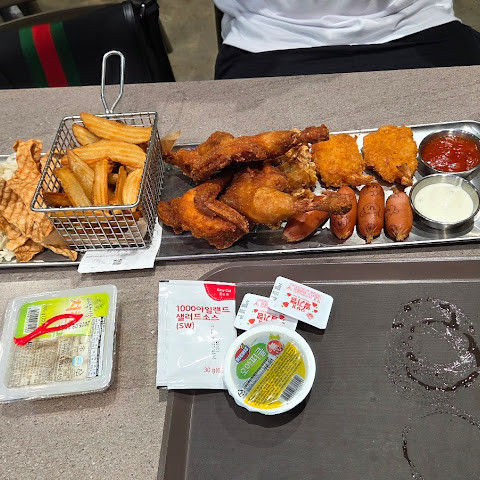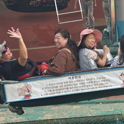 떠나는 길에 돼지꼬치를 파는 가판대를 지나쳤습니다. 냄새가 너무 좋아서 몇 개 사야 했죠! 에버랜드 직원들은 대부분 친절하고 훌륭했습니다. 그런데 꼬치 가게 계산원이 그냥 있고 싶어 하지 않았어요. 한국어를 못 해서 뭘 사야 할지 가리켰는데, 계산원이 눈을 굴렸어요. 신용카드로 계산했는데 영수증을 건네주면서 꼬치를 사러 가는 곳을 가리키더라고요.