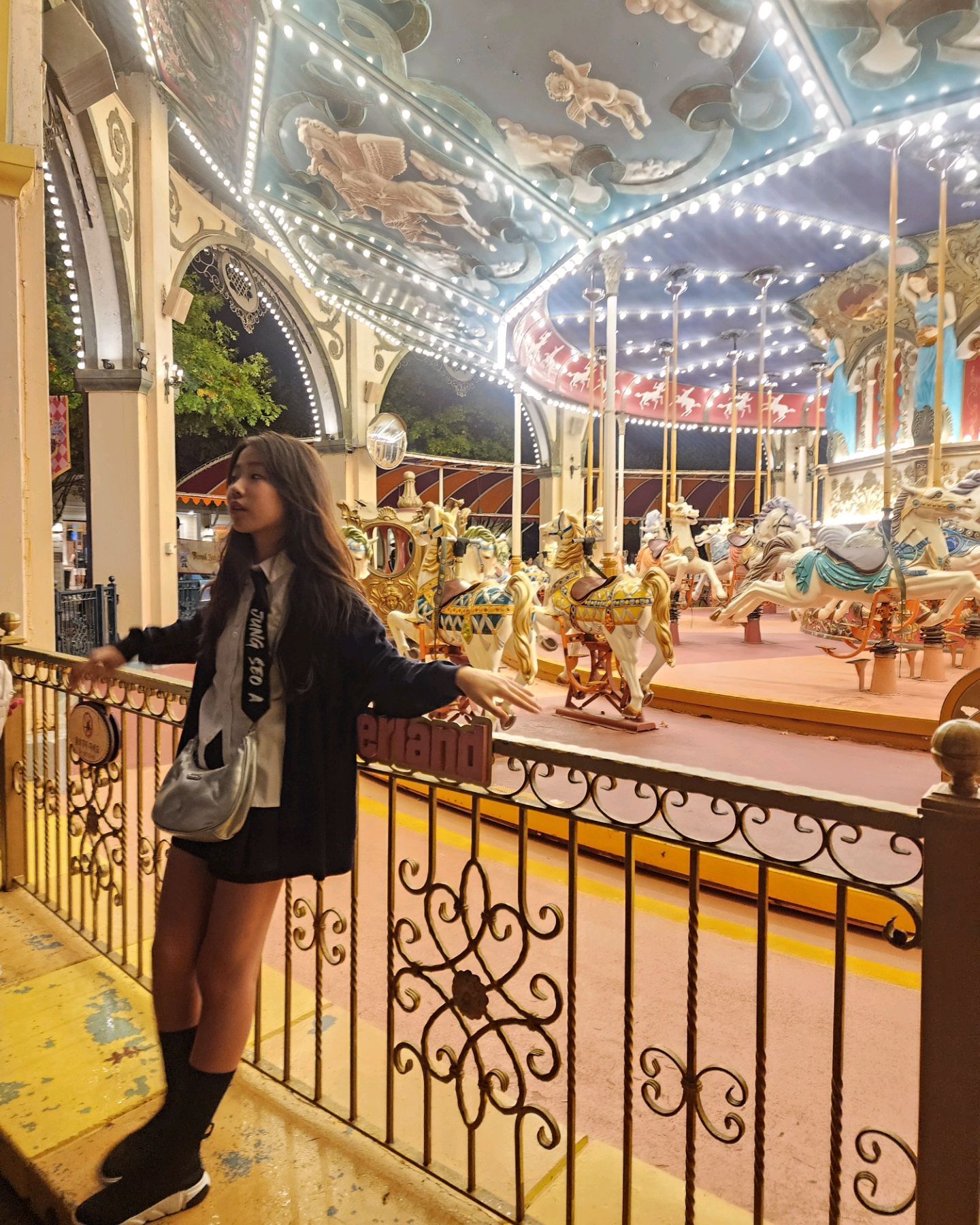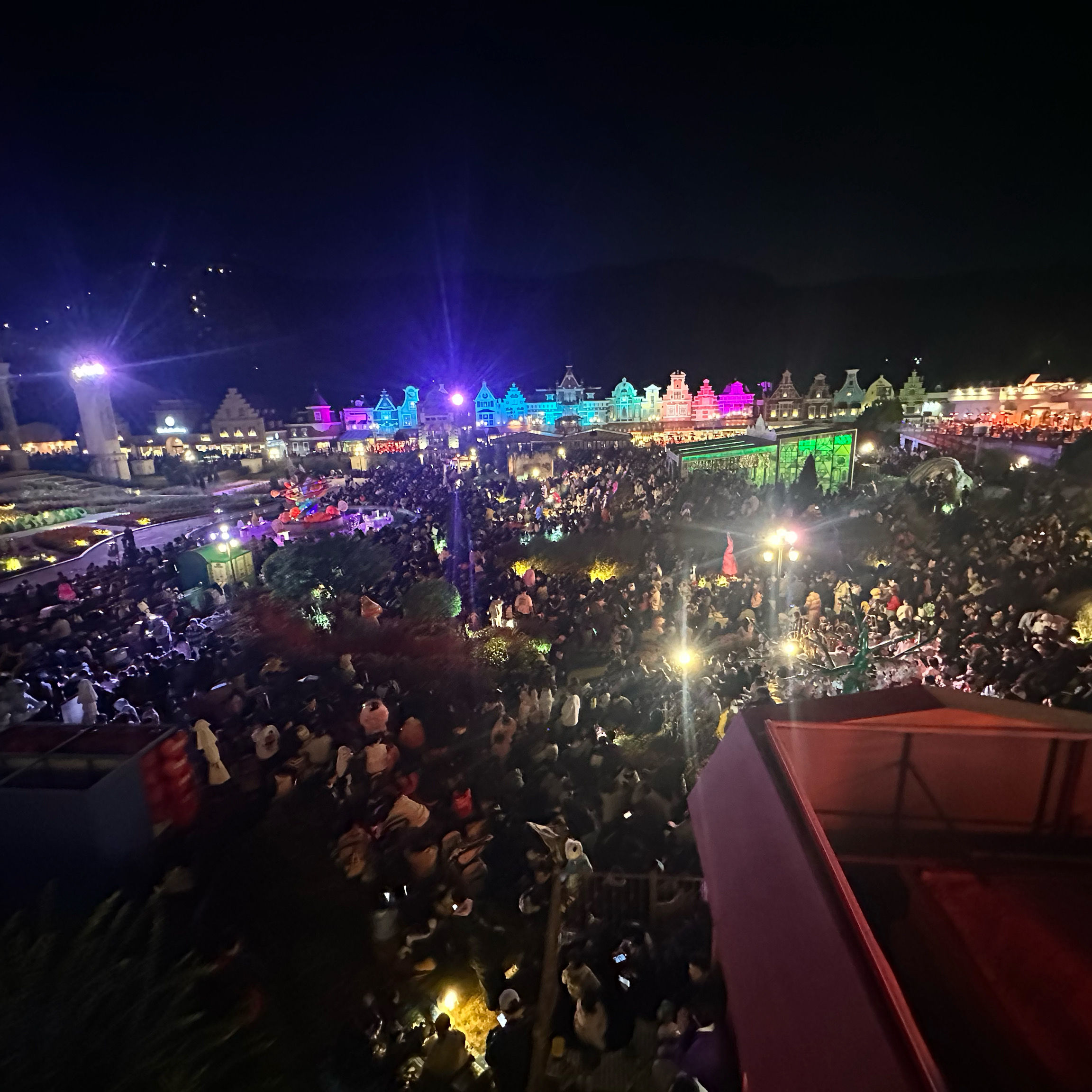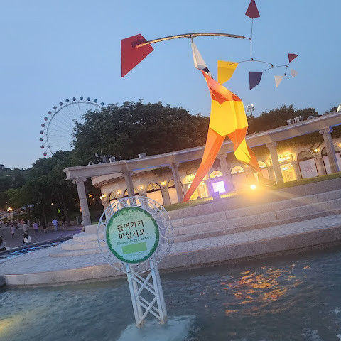 회전목마 쪽은 클래식한 조명 덕에 사진 잘 나오고, 분수대 근처는 색 조명이 계속 바뀌어 분위기 전환이 좋음.