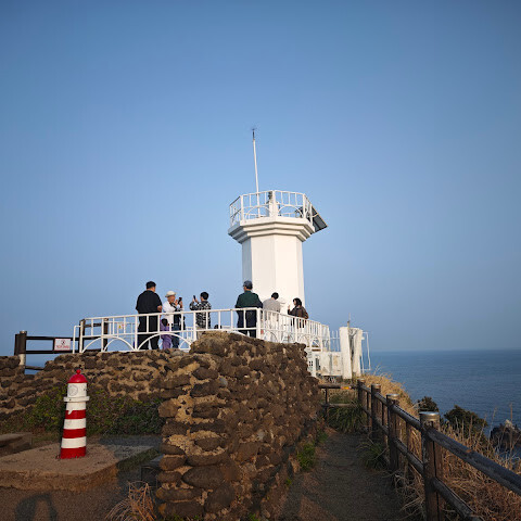 ✅ 방두포 등대: 붉은 화산 언덕 꼭대기에 자리한 하얀 등대가 트레킹의 종착점입니다! 철제 계단을 따라 등대 꼭대기에 오르면 방두포 해안선 전체와 멀리 우도 섬까지 360도 파노라마 전망을 감상할 수 있습니다.