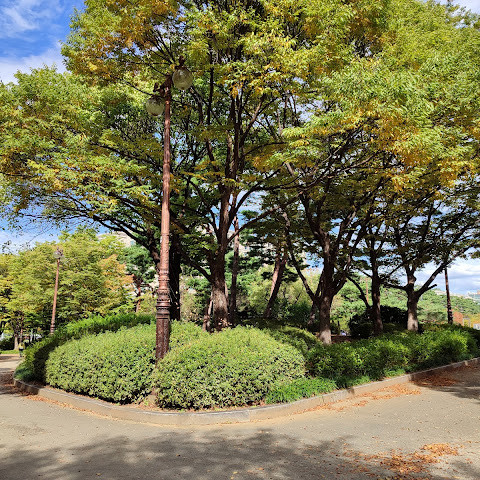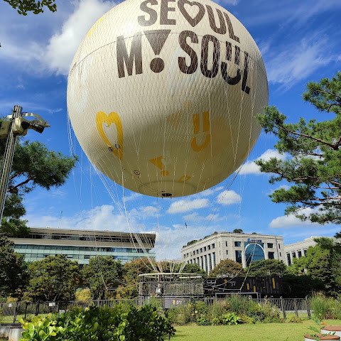 작은 다리와 흐르는 물이 있는 숲 공원이 있으며, 탈 수 있는 거대한 열기구인 서울문도 있어 산책하기 좋습니다.