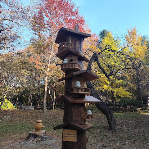 섬에는 여러 레스토랑과 카페가 있으며, 자전거를 빌려 섬을 둘러볼 수도 있습니다. 남이섬에는 2004년 인기 드라마 '겨울연가'의 명장면 조형물도 있습니다. 공작새, 다람쥐, 백조, 원앙 같은 야생 동물도 만날 수 있습니다. 제 생각에 섬이 가장 아름다운 시기는 중추절입니다.