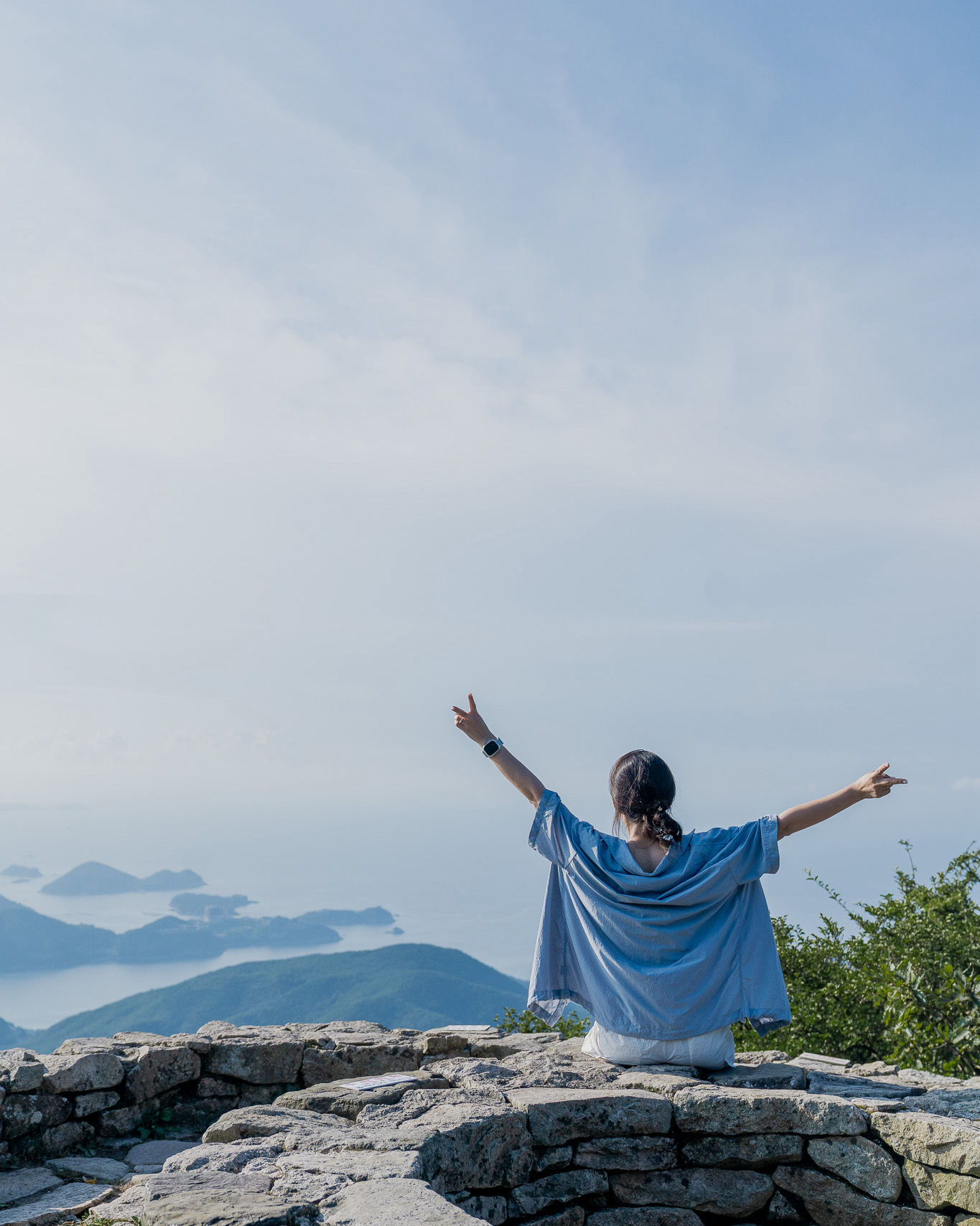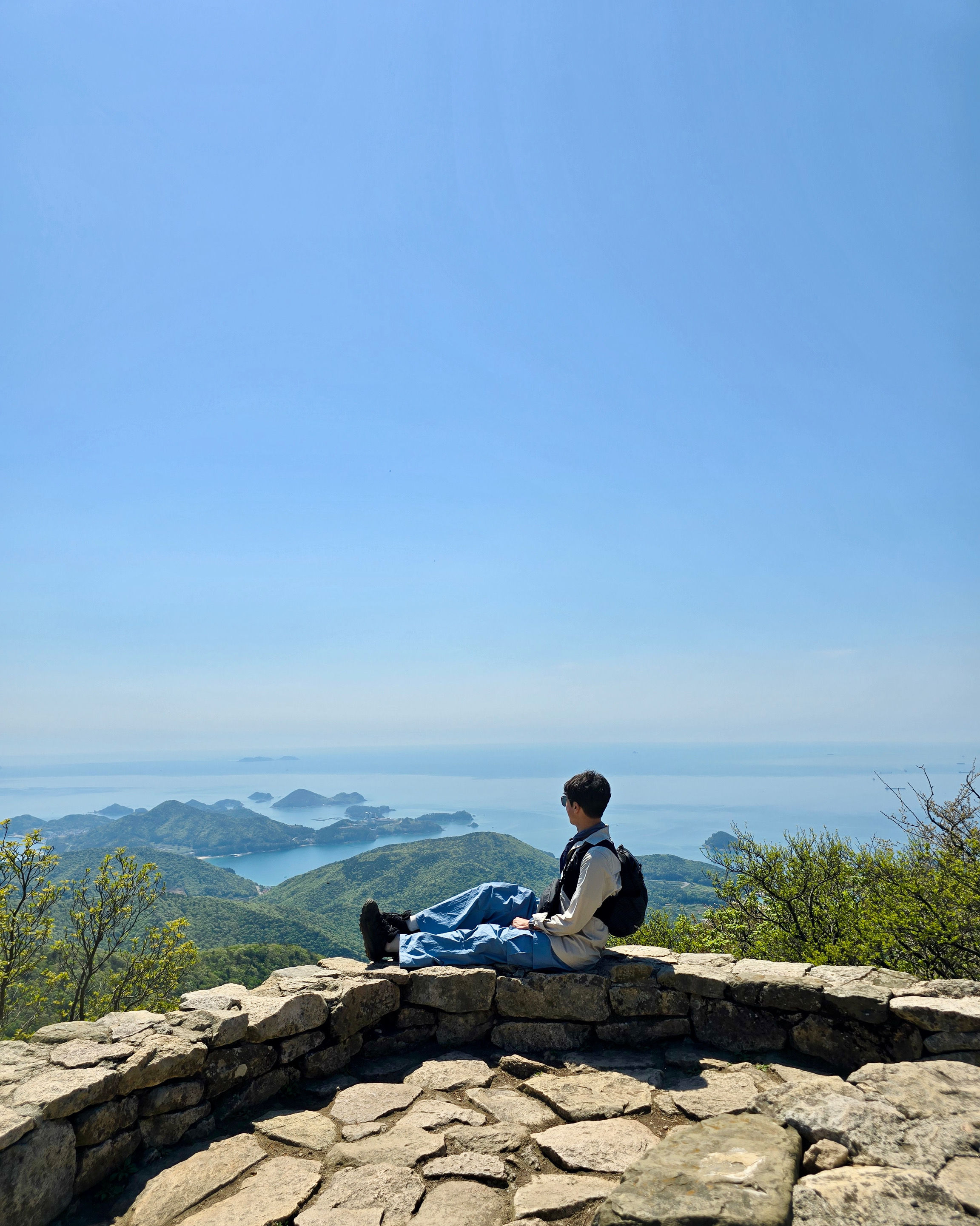 "남해금산" 정상에 왔는데 👍 바다 경치와 산의 조합이 정말 경이롭고 예술입니당❤️