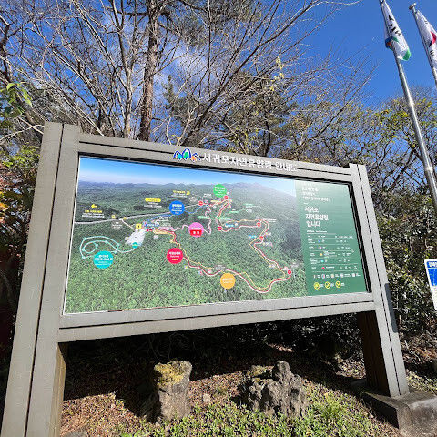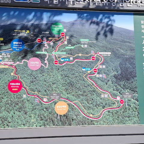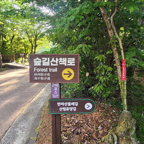 신선한 공기를 마시며 숲길을 걷고 싶은 분들에게 좋은 산책로입니다. 저는 안내문에 5km, 2시간 정도 걸린다고 적힌 숲길을 따라 걸었습니다. 3.5km 지점까지는 약 1시간 정도 걸렸습니다. 평지가 아니라 고르지 않은 곳이 있으니 주의하세요. 등산용 지팡이가 있으면 좋습니다. 3.5km 지점에서 주차장으로 돌아가는 힐링 트레일을 따라 걸었는데, 약 30분 정도 걸렸습니다. 숲길을 따라 평행 고속도로가 있다고 들었는데, 아마 어느 지점에서든 픽업 서비스를 받을 수 있을 것 같습니다.