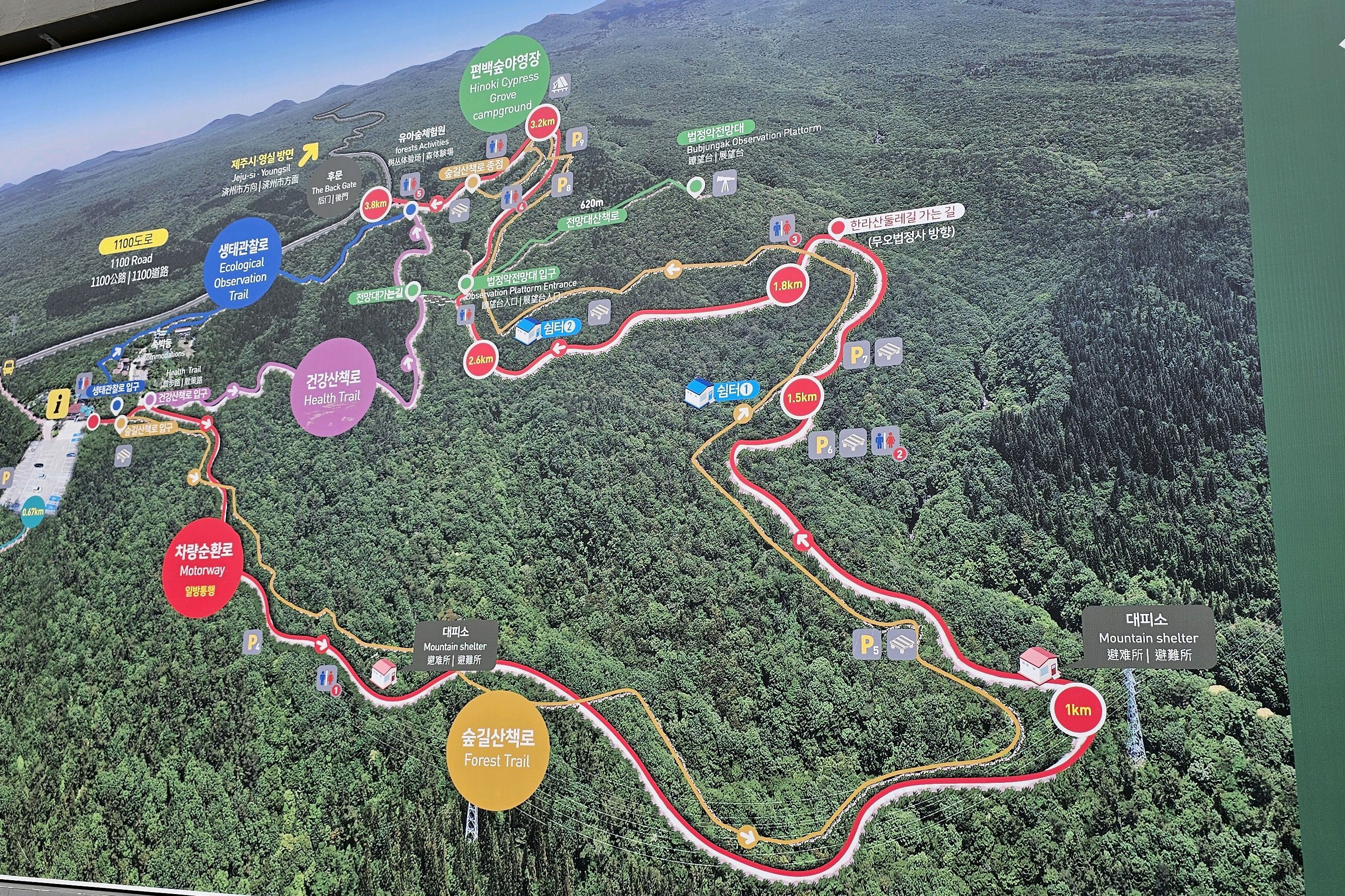 긴코스, 짧은코스, 차로 이동 할 수 있는 코스도 있고 전망대가면 바다와 섬도 보이고 1100고지 근처라 한라산 자락도 보여요.