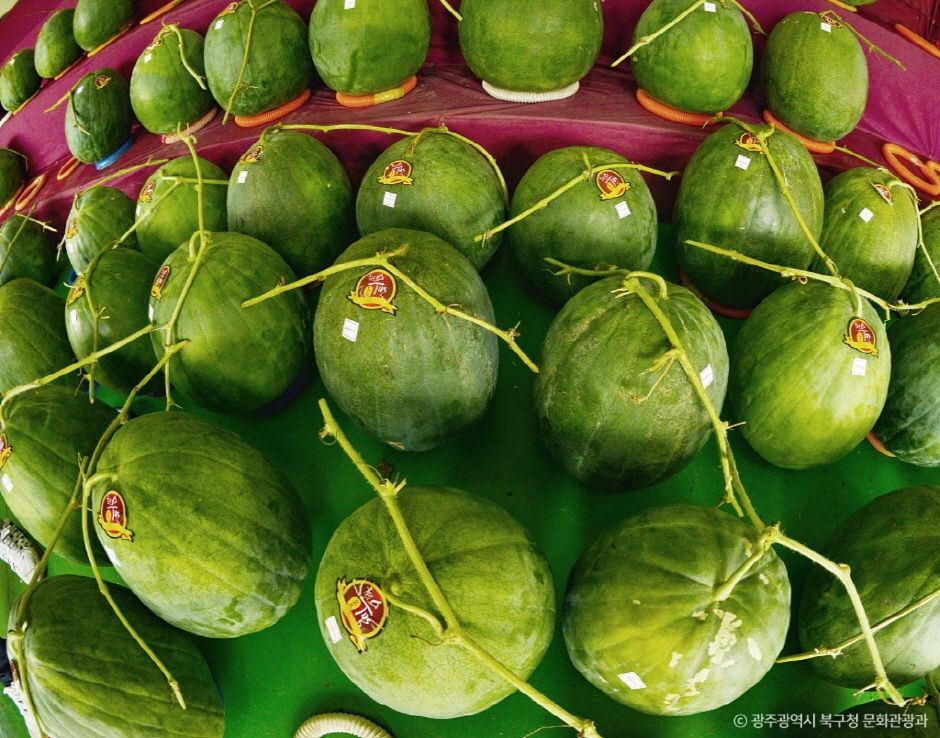 *무등산 수박 광주를 대표하는 무등산 수박은 재배조건이 까다로워 강한 광선, 높은 온도, 긴 일조시간 등이 받혀주지 않으면 길러내기 어렵다. 광주의 북구 일대는 이러한 절대적인 재배조건을 갖춘 곳이다. 이런 천혜의 조건 속에서 자란 무등산 수박은 특수한 향기와 맛이 별미로 특히 청록빛깔에 줄무늬가 없고 씨는 머리부분의 눈만 검어 다른 수박과는 구별된다. 옛날 임금에게 진상되던 수박으로 일명 『푸랭이 수박』이라고도 불린다. |