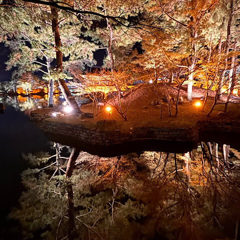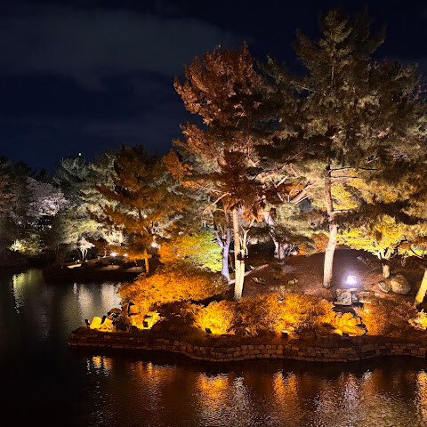 입장료는 3,000원이고 기념품 가게도 있어요. 밤에 갔더니 물에 비친 나무와 건물들의 모습이 아름다웠습니다. 주변에 산책로도 있지만 날씨가 쌀쌀해서 이용하지는 못했어요. 공원 안에 화장실과 기념품 가게가 있습니다.