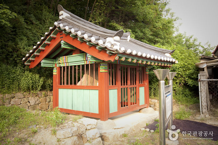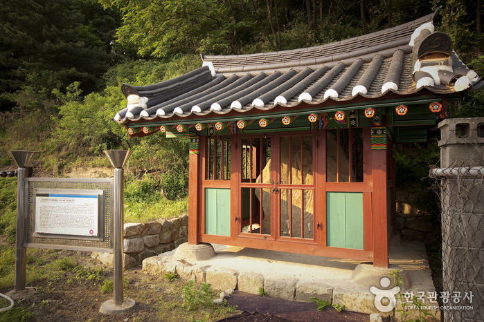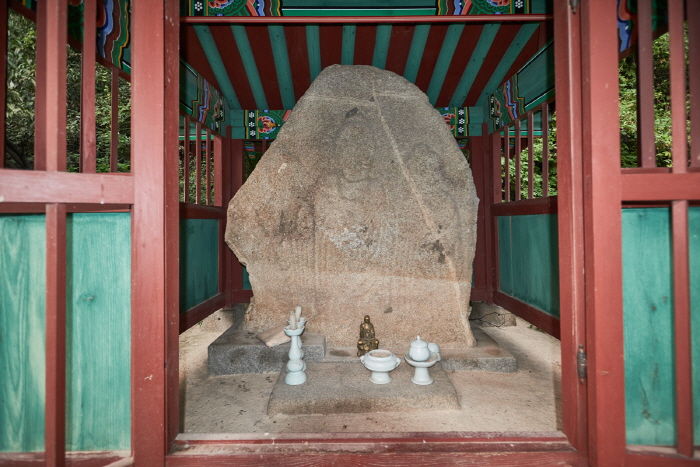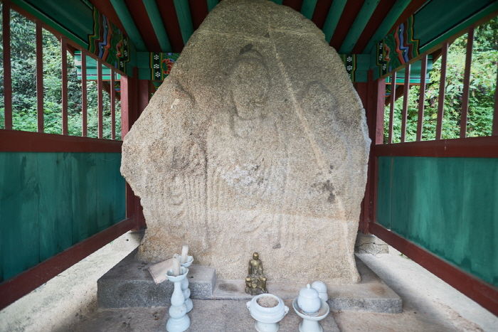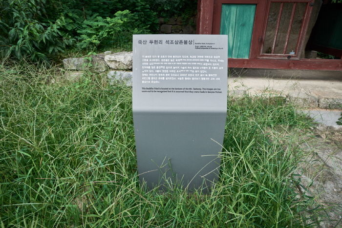 두현리 석조삼존불상은 태봉산 아래 민가 옆 보호각 안에 봉안되어 있으며 불상은 지상에 노출된 전면에 저부조(低浮彫)로 입상의 삼존(三尊)을 조각하였다. 삼존불상은 허리 이하가 땅속에 묻혀 있어 전체 높이를 알 수 없지만 지상에 노출된 높이가 본존 118cm, 우협시보살(右挾施菩薩)이 86cm, 좌협시보살이 99cm이다. 삼불상은 마모가 너무 심하여 세부적인 표현을 알 수 없는데 전체적으로 불신에 비하여 불두(佛頭)가 크게 강조된 것이 특징이다. 또 본존은 높은 육계(肉桂)를 지니고 목에는 희미한 삼도(三道)가 표현되었으며 양 어깨를 덮은 통견은 밑으로 늘어져 가슴과 허리 밑으로 U자형의 옷 주름이 길게 늘어져 있다. 석불의 뒷면은 아무 조식(彫飾)을 가하지 않았다. 고려시대의 작품으로 추정되지만 훼손이 너무 심하여 불상의 세부 표현을 거의 알 수 없을 정도이다. 두현리 마을 주민들이 더 이상의 훼손을 방지하기 위하여 보호각을 만들어 보존하고 있다.