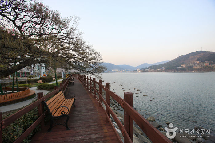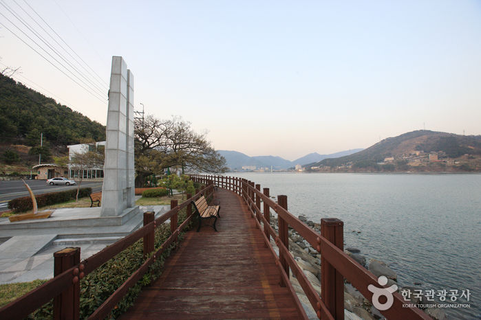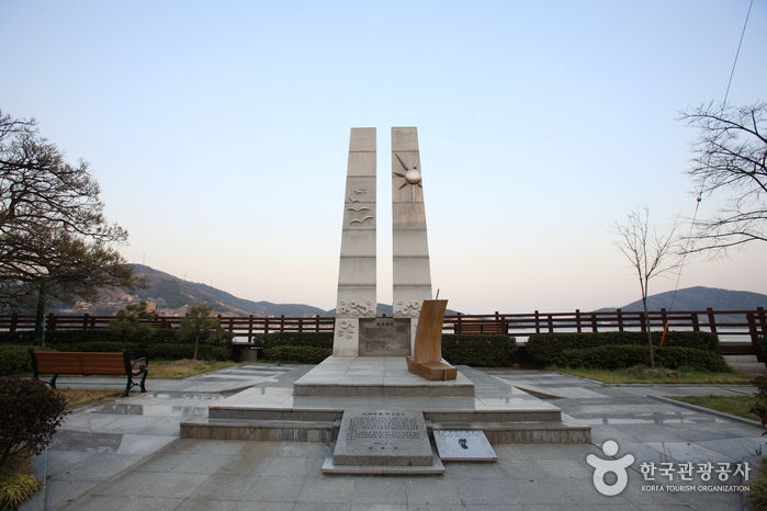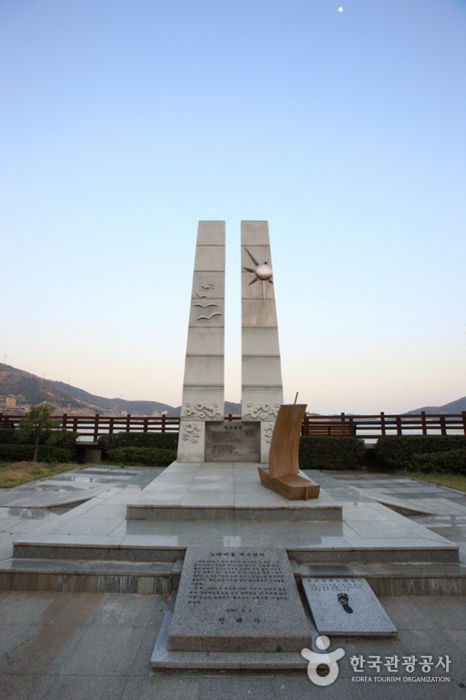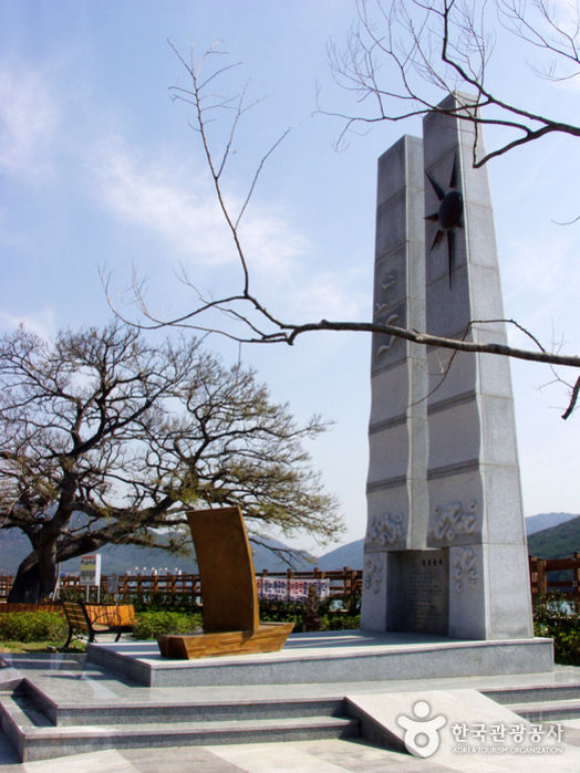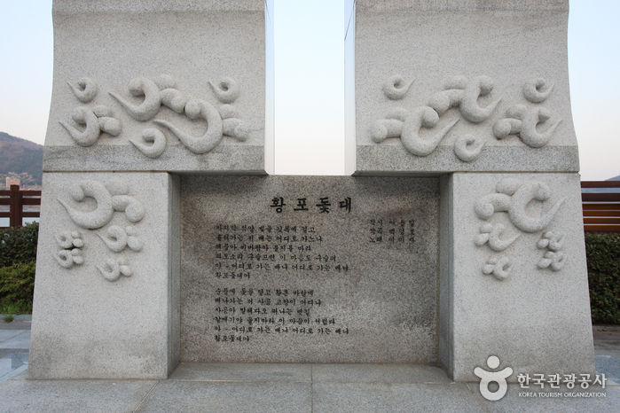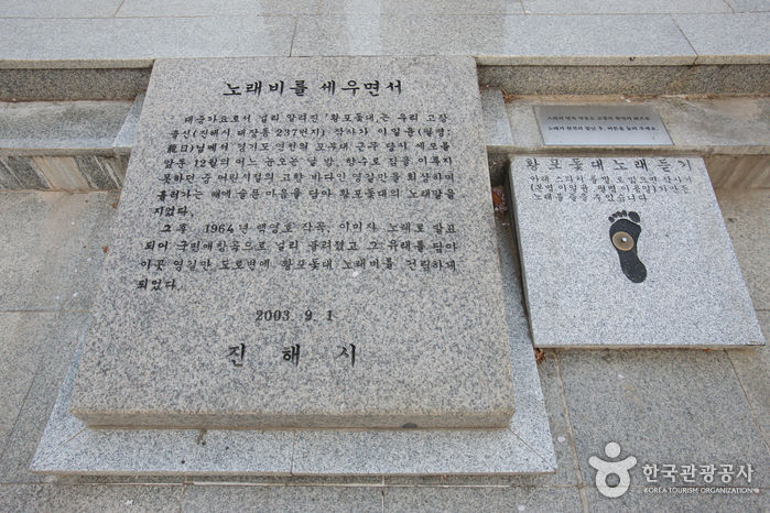 황포돛대 노래비는 진해 흰돌메 공원에서 부산 방향으로 약 800m 떨어진 영길만 해안관광도로변에 세워져 있다. 대중가요로 널리 알려진 노래 [황포돛대]는 이 고장 출신인 작사가 이일윤(필명 : 용일) 선생이 경기도 연천의 포부대 근무 당시, 세모를 앞둔 12월 어느 눈 오는 날 밤 고향 바다인 영길만을 회상하며 노랫말을 만들었고, 군 제대 후인 1964년 백영호 작곡, 이미자의 노래로 발표하게 되어 국민 애창곡으로 널리 불리게 되었으며, 그 유래를 담아 이곳 영길만 도로변에 황포돛대 노래비를 건립하게 되었다. 가로 5m, 세로 6m, 높이 7m 규모로 화강석과 청동을 재료로 하여 2003년 조각가 이창헌 선생에 의해 제작된 노래비의 작품명은 『고향의 향수』이다. 노래비 전 면에는 노래 가사가, 뒷면은 작품 설명이 새겨져 있고, 뒤쪽에 버튼을 누르면 [황포돛대] 노래가 흘러나와 노래를 감상할 수 있다. 노래비가 있는 도로는 남파랑길 6코스에 해당하는 아름다운 둘레길이며, 흰돌메공원 등 주변 관광지를 둘러볼 수 있는 곳이다.