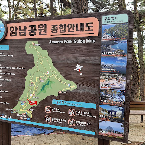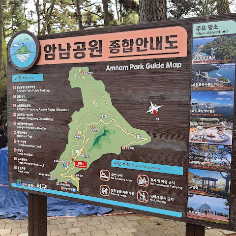 소개합니다. 도심 속 청정한 숲, 암남공원. 562,500㎡에 달하는 이 자연공원은 동쪽으로는 남강, 서쪽으로는 감천항, 앞쪽으로는 동물 검역소, 남쪽으로는 한령성 국립공원과 접하고 있습니다. 부산 서구 암남동에 위치한 암남공원은 번화한 남포동 지역에서 4km도 채 떨어져 있지 않습니다. 과거 혈청 검사소 입구였던 이 길은 송도 해안과 부산 남강의 탁 트인 전망을 선사하며 아름다운 해안 경관을 자랑합니다.