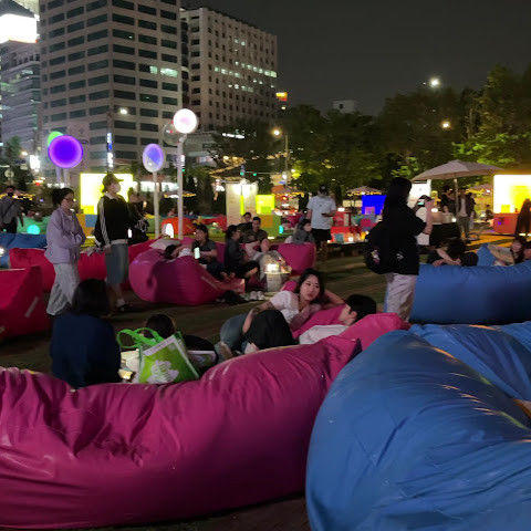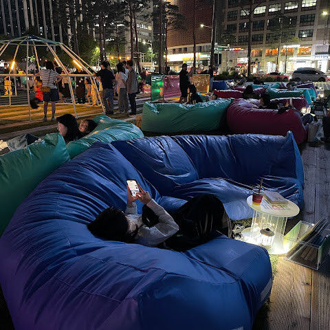 광장 전체에 많은 퍼프와 의자가 펼쳐져 있는 사랑스러운 장소입니다. 아름다운!!!
