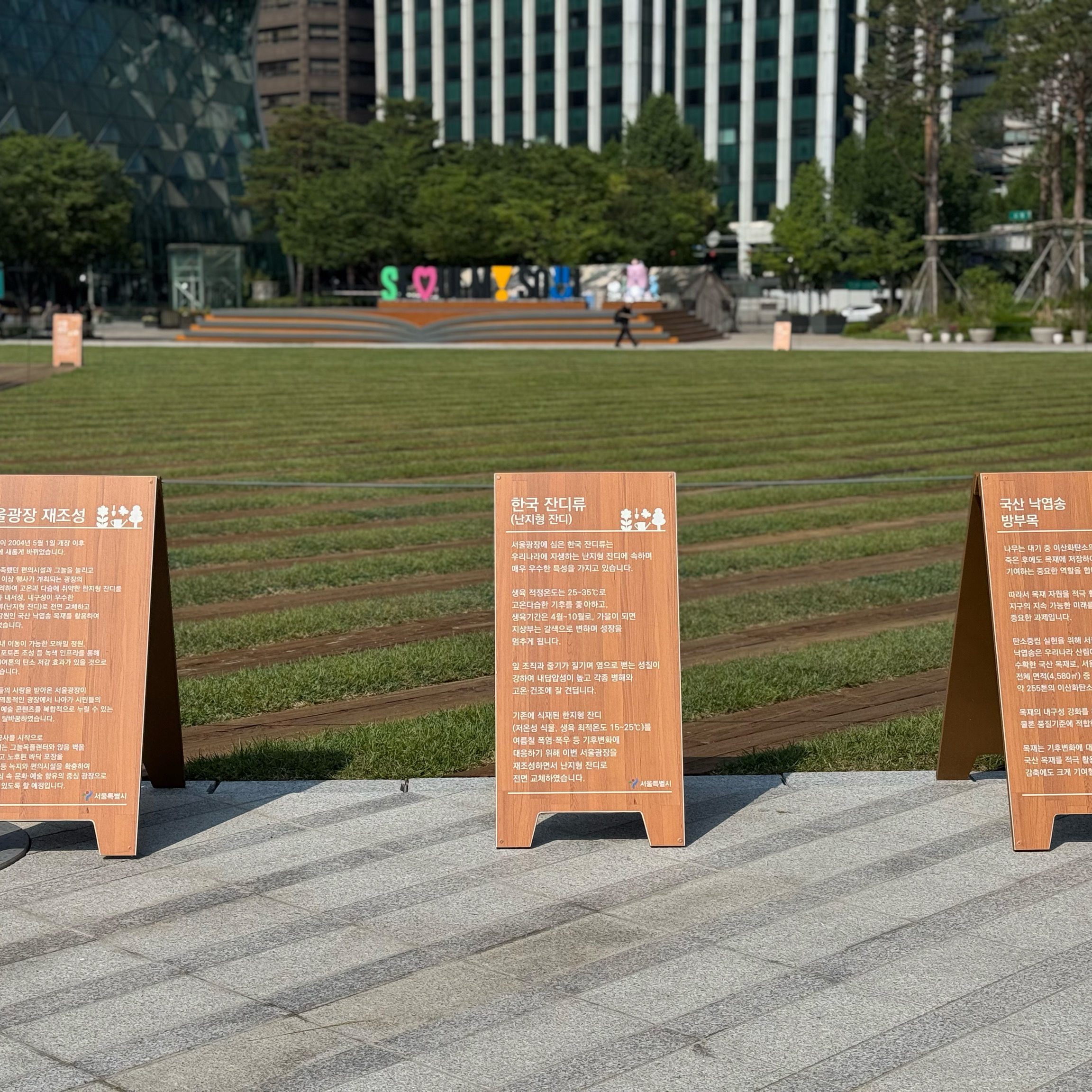 서울광장은 서울의 심장과 같은 곳이죠. 잘 관리된 조경목과 분수광장, 그리고 최근에는 잔디 훼손을 방지하기 위하여 스트라입 형태로 나무데크도 설치되었네요. 어찌 보면 넓지 않은 면적의 공간이지만, 삭막한 서울 한복판에 여백처럼 남아 있어서 참으로 다행이란 생각이 들어요. 연중 각종 행사와 집회로 시끌벅적한 공간이기도 하죠. ㅎㅎ