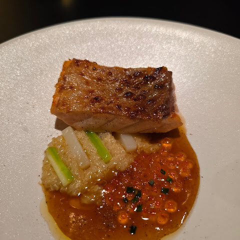 정식연어. 껍질은 노릇하게 구워지고 속은 분홍빛으로 완벽하게 익었어요. 모든 층의 색깔이 똑같았죠. 퀴노아, 아스파라거스, 간장과 연어뼈 버터 소스, 이쿠라가 곁들여져 나왔어요.