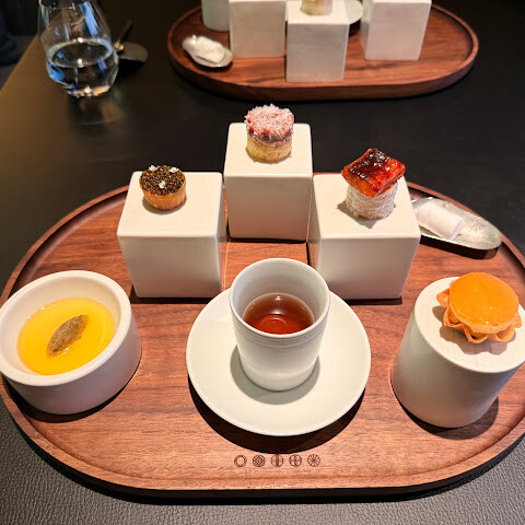 세심하게 구성된 테이스팅 메뉴는 예술적이고 맛있는 놀라움으로 가득한 이야기로 펼쳐집니다. 여정은 한입 크기의 아뮤즈부슈 컬렉션으로 시작되는데, 각 아뮤즈부슈는 한국 전통 반찬을 축소하여 재해석한 것으로, 사랑받는 주요 반찬에 독창적인 변형을 더합니다. 처음 맛보는 이 작은 조각들은 독특하고 조화로운 풍미로 가득 차 앞으로 펼쳐질 요리의 분위기를 완벽하게 조성합니다.