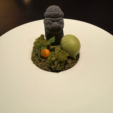 이 특별한 경험은 기억에 남는 돌하르방과 같은 독창적인 디저트로 마무리됩니다. 제주도의 상징적인 석상에서 영감을 받은 이 요리는 섬세한 녹차 무스와 크리미한 가나슈가 시각적인 매력과 풍미를 모두 선사하는 진정한 예술 작품입니다.