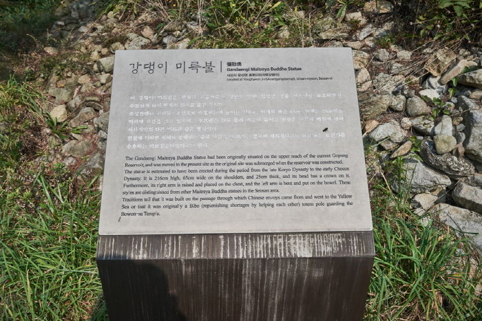 이 미륵불은 강댕이로 진입하는 지점에 설치된 강당교에서 북쪽으로 약 100m 지점의 전(前) 군장동 안, 현(現) 고풍저수지 안에 있었다. 이곳은 지대가 높아 지금도 섬처럼 되었으며 풀이 자라고 있어 쉽게 확인할 수 있다. 이곳이 저수지로 수몰되게 되어 현재의 위치로 옮긴 것이다. 조성연대는 고려말~조선초로 추정되는데 높이는 216cm, 어깨의 폭은 65cm, 두께는 25cm이고 머리에 보관을 쓰고 있으며, 오른팔을 위로 올려 가슴에 붙이고, 왼팔은 구부려 배 위에 대어 서산지방의 다른 미륵과 같은 형식이다. 전설에 의하면 서해로 통하는 중국 사신들이 오가는 통로에 세워졌다고 하며 또는 보원사를 수호하는 비보장승이었다고 한다.