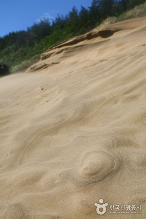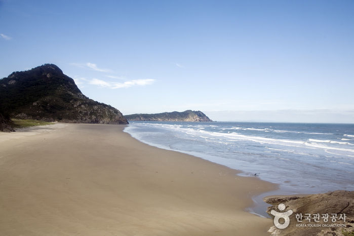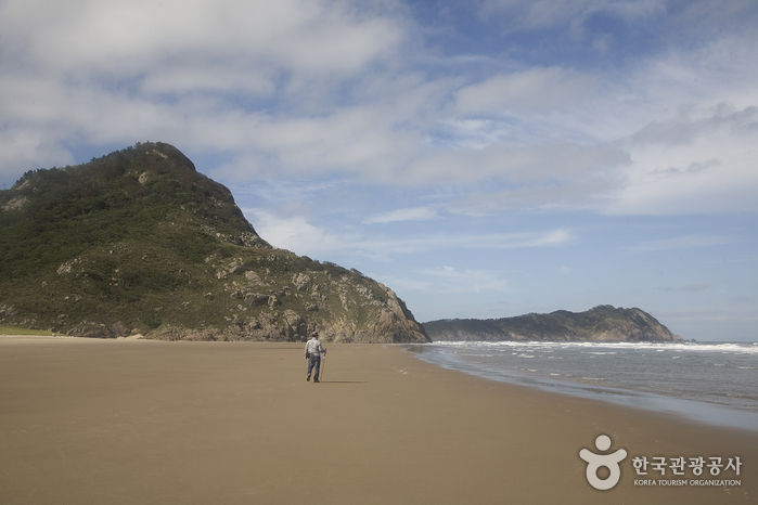 띠밭넘어해변은 호젓하게 야영을 즐기고 싶은 사람들에게 천혜의 야영지로, 오랜 풍화작용으로 모래가 80m 정도 높이로 쌓이면서 만들어진 모래산과 수려한 노송은 우리나라에서 보기 드문 광경을 선물해 준다. 하지만 외지 사람이 잘 찾지 않아 관광객을 위한 편의시설이 부족한 편이지만 오히려 이 때문에 자연 그대로의 모습으로 남아있다. 봄에는 동백꽃이 만발하고 후박나무의 천리향이 섬 전체에 은은하게 퍼지는 꽃섬으로, 여름에는 무공해 피서지로, 가을이면 단풍 섬으로 옷을 갈아입는 자연경관 덕분에 사진을 찍기 위한 사진작가들이 많이 찾는 촬영 장소로 유명하다. |