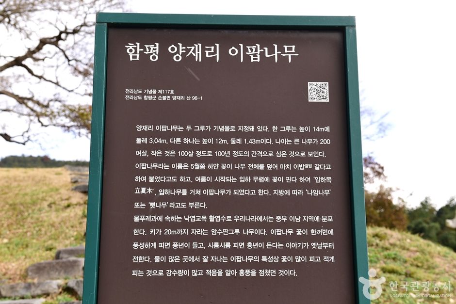 손불면 양재리 함평 모씨 종중 모 씨 소유인 수정재 뒤편 동산의 소나무 숲 안에 두 그루의 이팝나무가 나란히 서있다. 그중 한 그루는 높이 14m이고 줄기의 가슴 높이 줄기둘레는 3.04m이며, 다른 한 그루는 높이 12m, 줄기의 가슴 높이 둘레 1.43m로 두 그루의 굵기 차이가 크다. 크기로 보아 앞의 나무는 수령이 200여 살, 뒤의 나무는 100년 전후로 추정되어 약 100년의 간격을 두고 심은 것으로 여겨진다. 5월이 되면 이팝 나뭇가지에 하얀 꽃들이 한꺼번에 흐드러지게 피어 나무가 눈에 덮여 있는 것으로 착각할 정도이다.