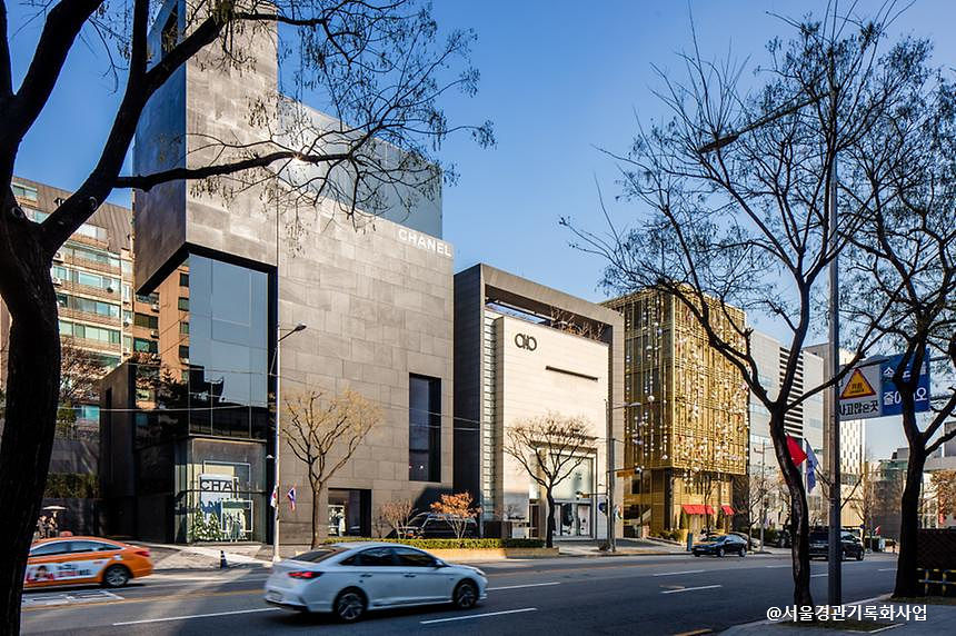 청담역 사거리에서 갤러리아 백화점에 이르는 대로변에는 명품 브랜드 매장이 밀집되어 있다. 패셔니스타들의 주요 쇼핑 장소인 이름하여 청담동 명품 거리. 국내 유일의 패션특구로 최근 청담 패션 거리라는 공식 명칭을 갖게 되었다. 한류 열풍에 힘입어 일본 관광객들의 관광 코스로도 각광받고 있다. 대로의 안쪽 골목으로는 유명 레스토랑도 몰려 있다. 근래에는 편집 매장과 갤러리들이 대거 들어서면서 쇼핑과 문화를 동시에 즐길 수 있는 공간으로 사랑받고 있다.