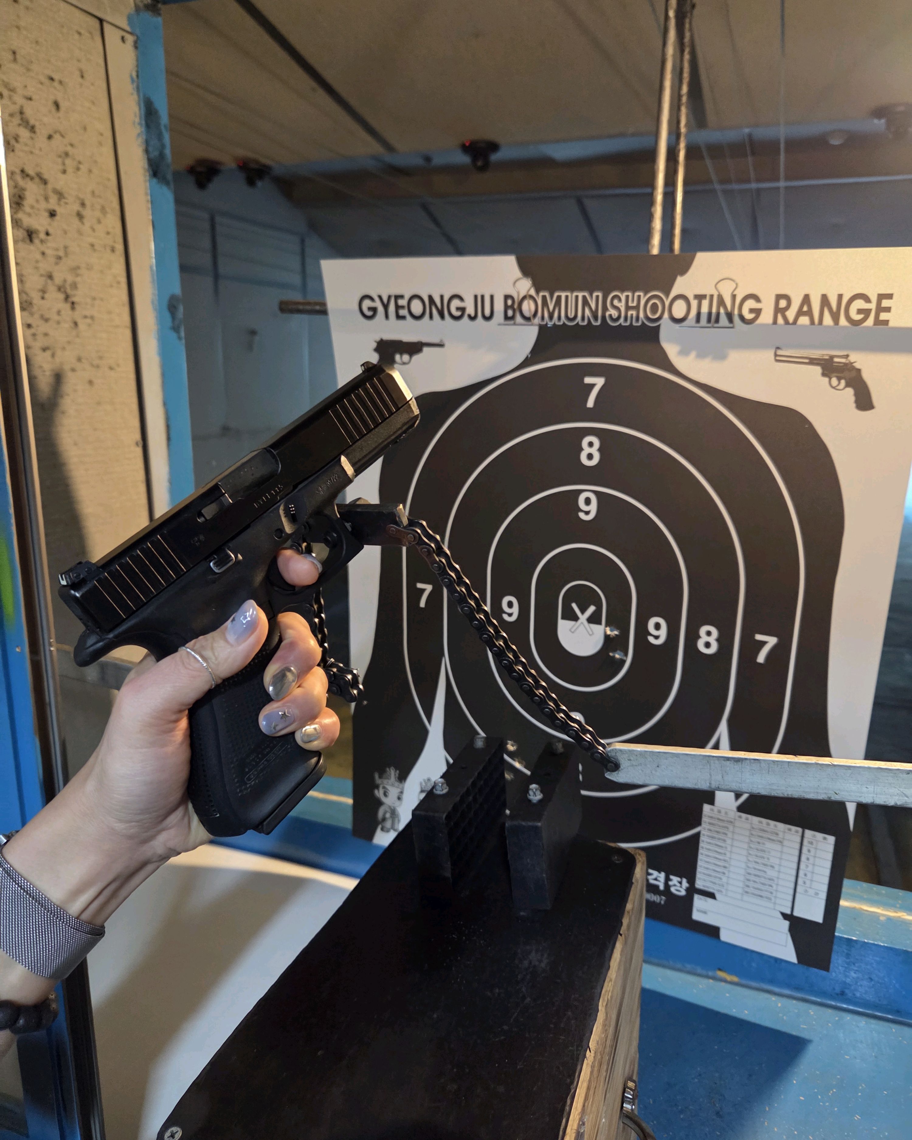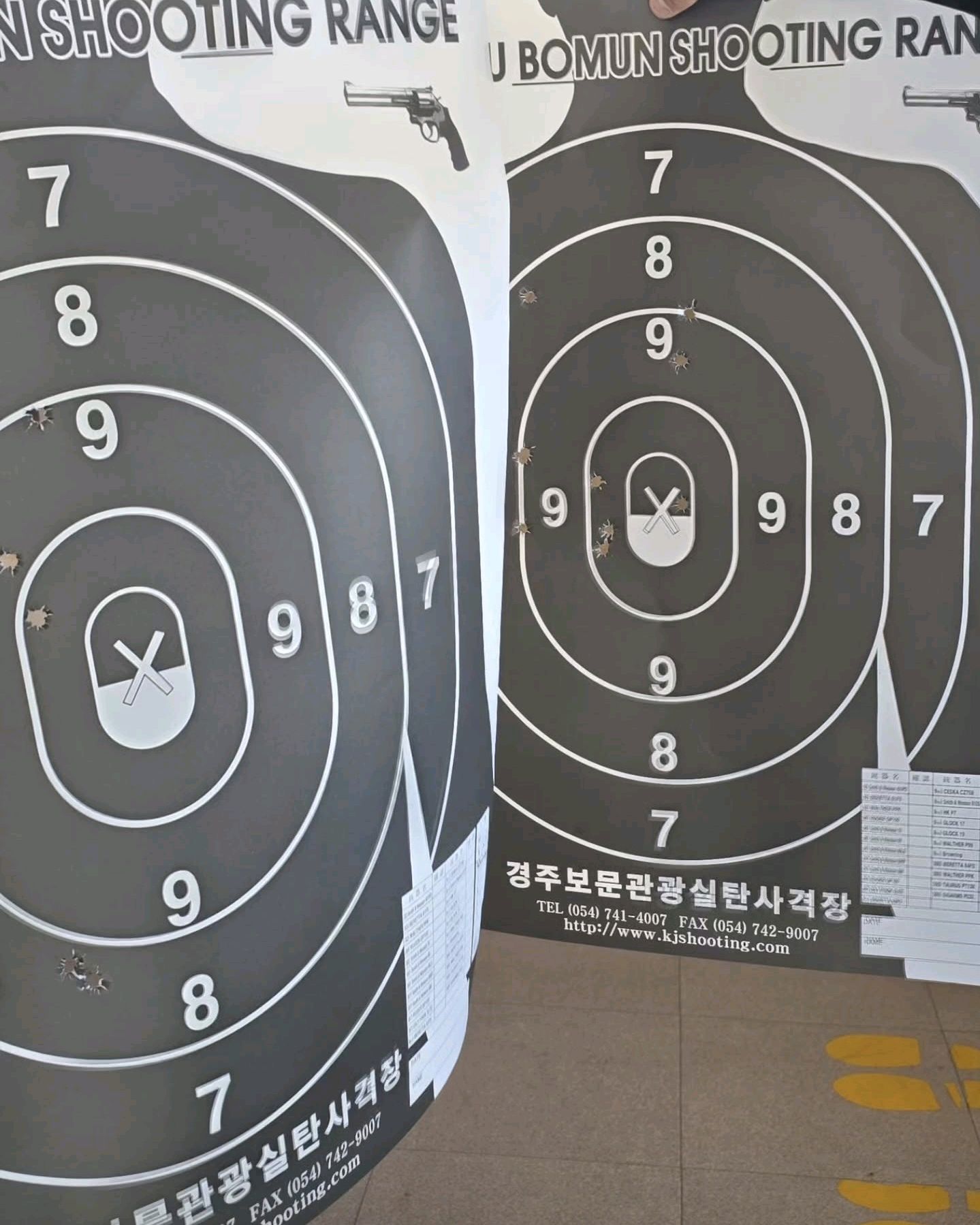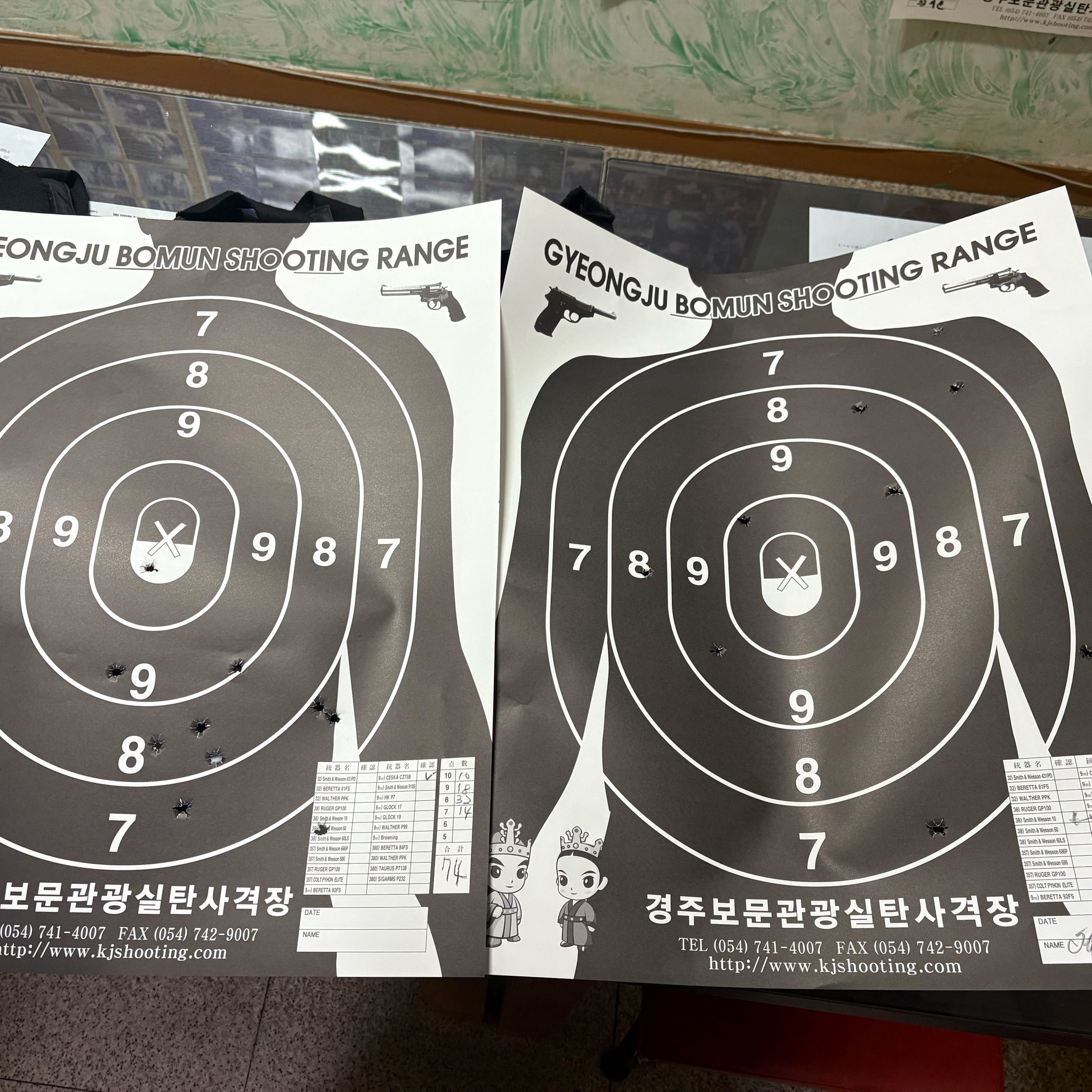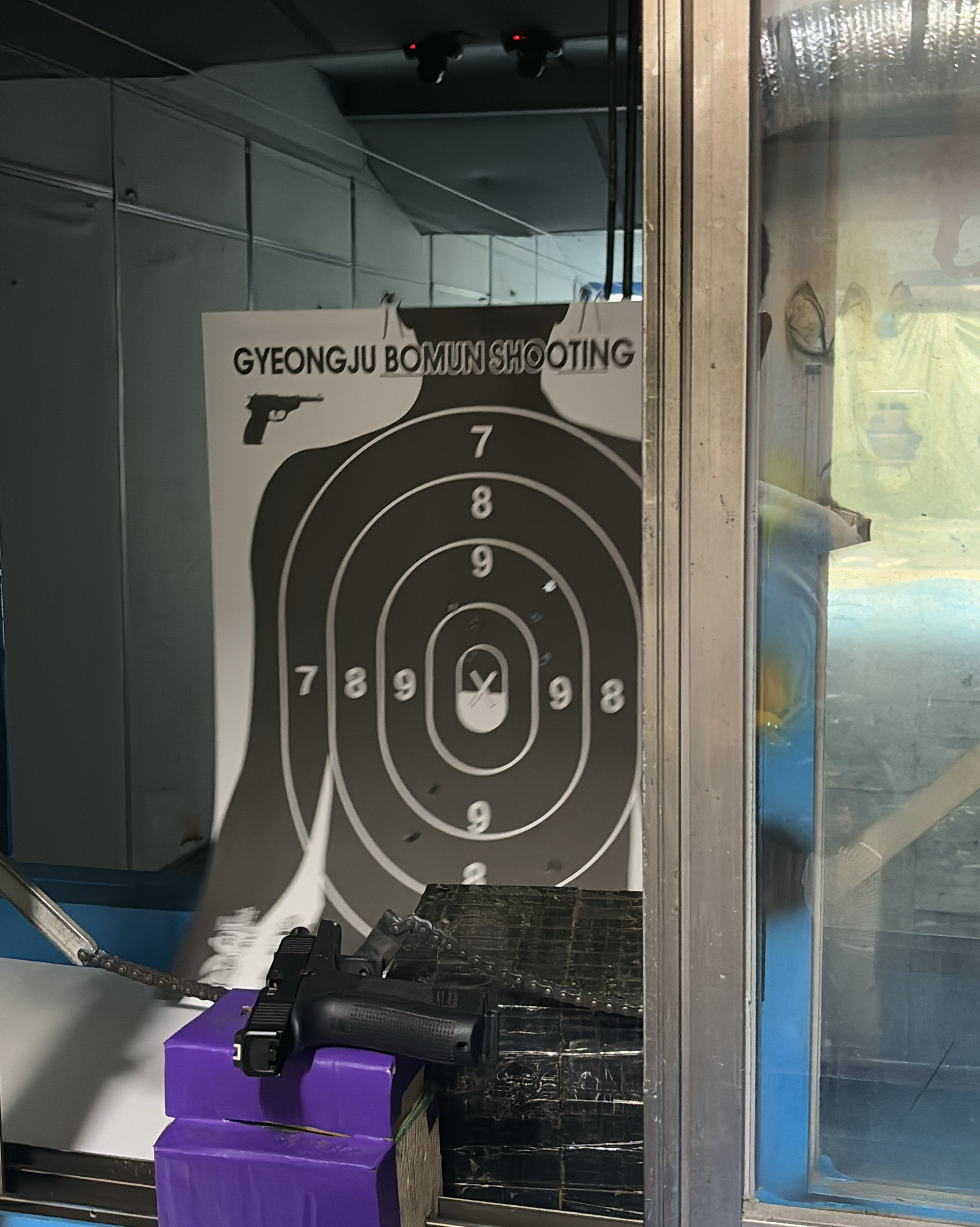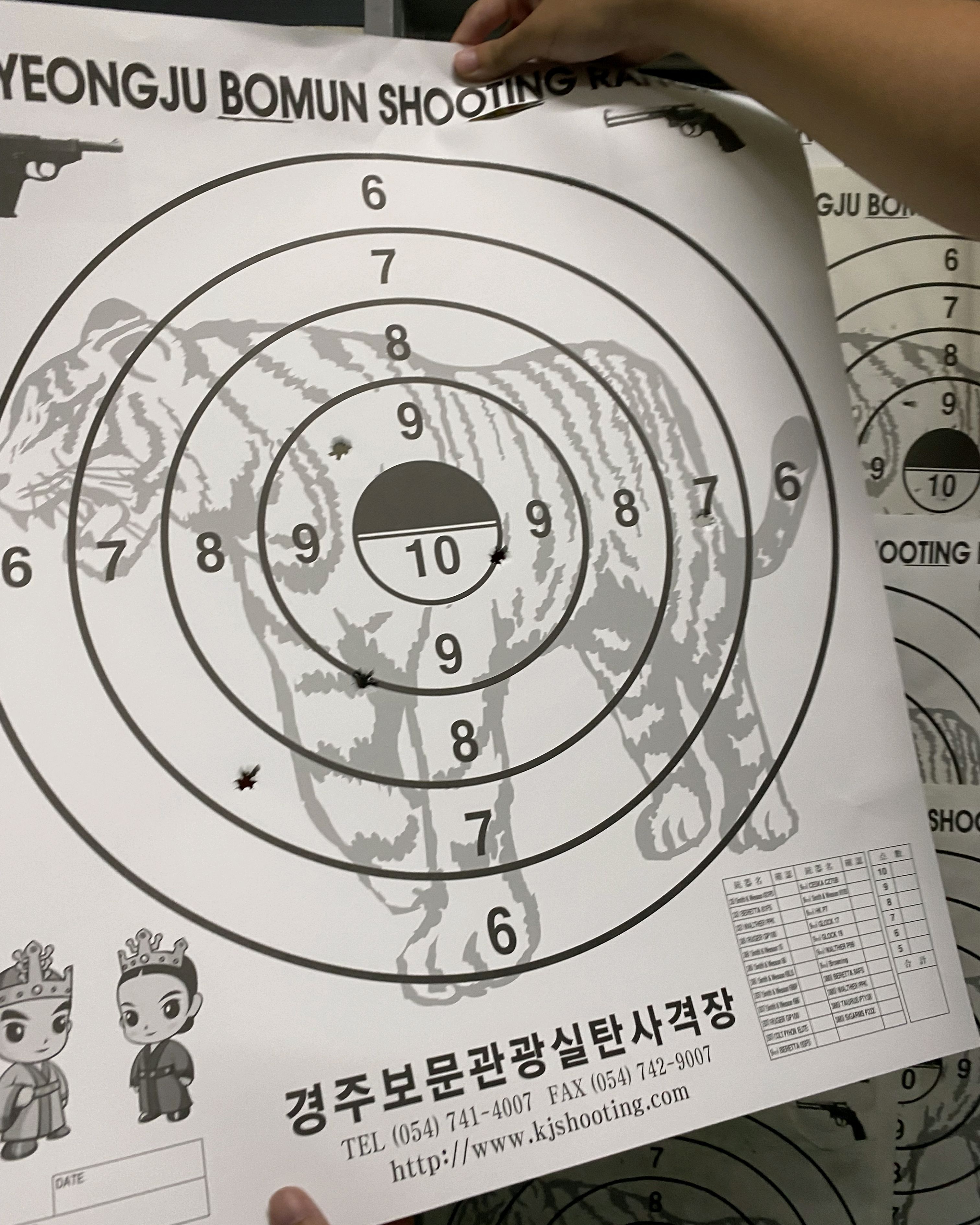 부모님과 경주 놀러갔다가 방문했어요. 원래는 제가 사격을 할 계획이었는데, 제가 손가락 골절로 총기를 쥘수가없어 아버지가 대신 체험해보셨는데 실탄이들어가는 묵직한 그립감의 권총을 잡는 순간 예전 군생활이 떠올라 비록 예전명사수시절 만큼의 결과를 내지는 못했지만 재밌는 경험이었다고 좋아하셨어요