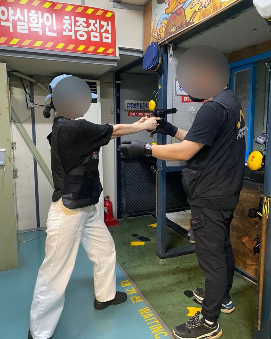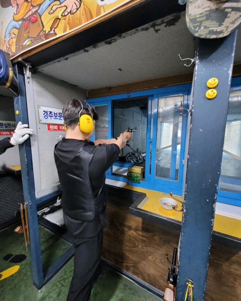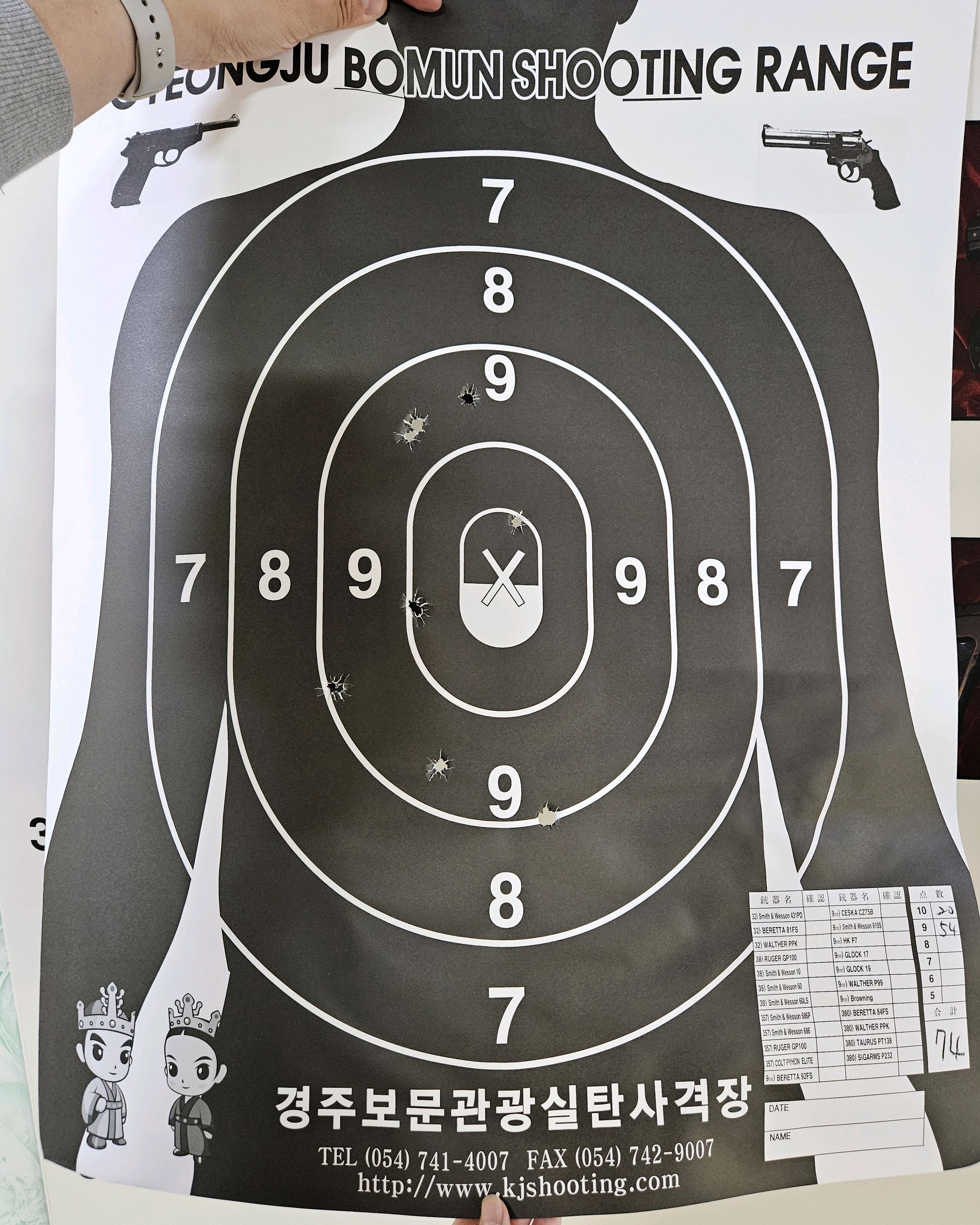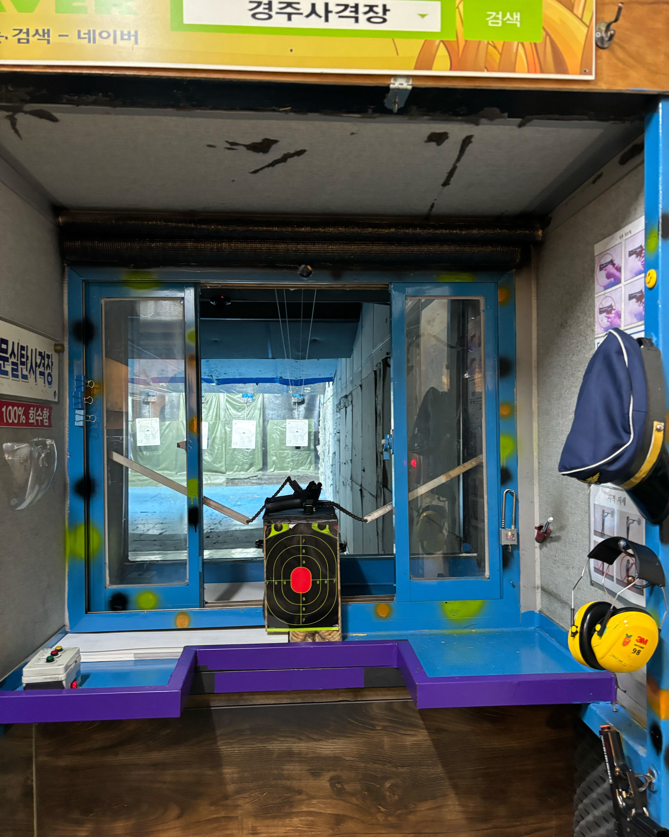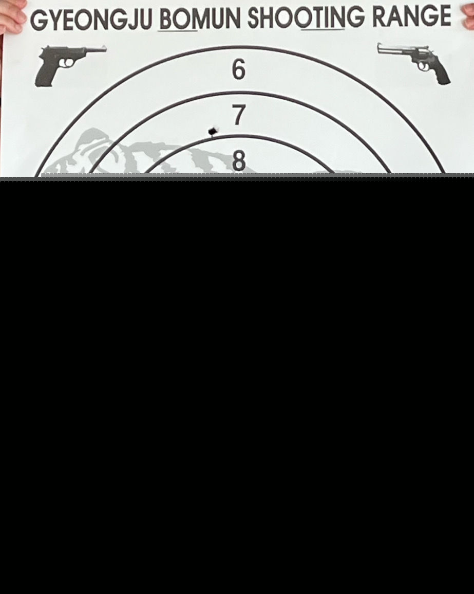 부모님과 경주 놀러갔다가 방문했어요. 원래는 제가 사격을 할 계획이었는데, 제가 손가락 골절로 총기를 쥘수가없어 아버지가 대신 체험해보셨는데 실탄이들어가는 묵직한 그립감의 권총을 잡는 순간 예전 군생활이 떠올라 비록 예전명사수시절 만큼의 결과를 내지는 못했지만 재밌는 경험이었다고 좋아하셨어요