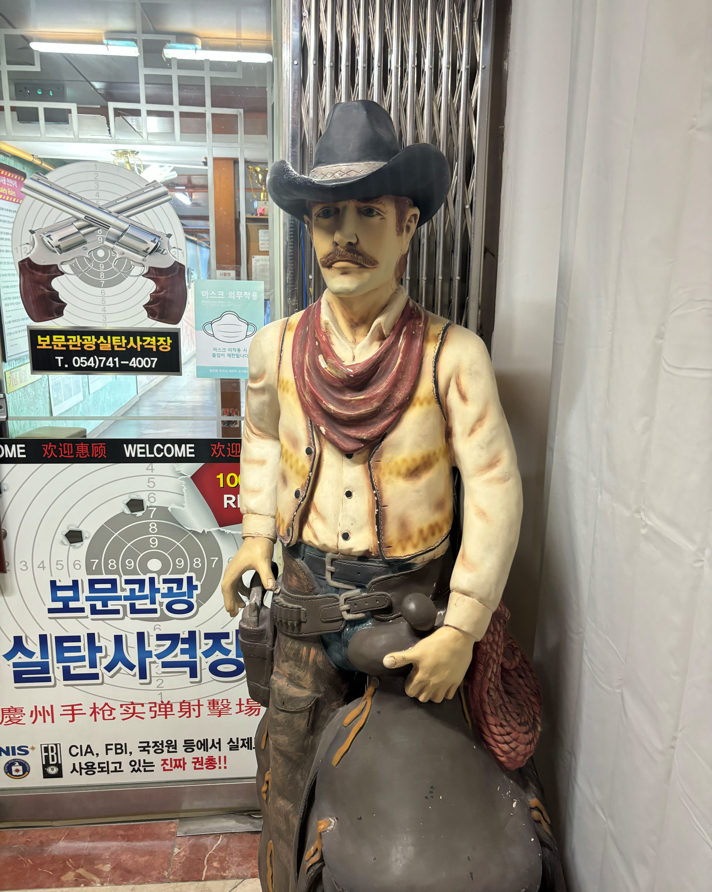 ㅋㅋㅋ 실탄사격 처음인데 쉽지 않네요 42점이 나올줄이야,,🤣🤣 금요일 오후에 대기 없이 갔고, 사격장건물이 주차장이랑 가까워서 좋았어요! 카우보이 모자같은 소품도 있어서 기념사진 찍기 재밌습니다 🤩👍 사장님도 유쾌하시고, 데스크 직원분도 친절하신데, 총 설명도 자세히 해주시니 경주가면 들릴만 해요!