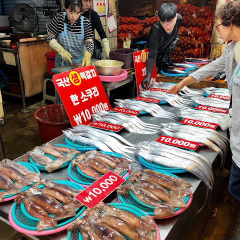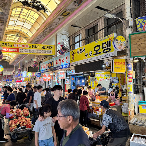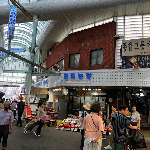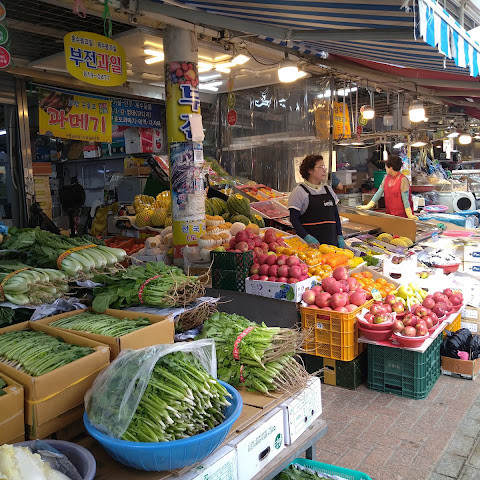 전통시장에서 쇼핑하는 것을 좋아하시는 분이라면 이 시장에서 3~4시간을 보낼 수 있을 것입니다. 신선한 고기, 채소, 과일을 판매하는 것 외에도, 돈까스, 김밥, 족발, 닭고기, 떡, 어묵, 국수, 그리고 두유와 같은 조리된 음식들을 포장해서 가져갈 수 있습니다. 해산물 요리를 파는 해산물 가게도 있습니다.