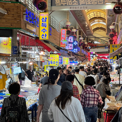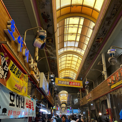부산에서 가본 시장 중 최고였던 것 같아요. 다른 관광객 대상 시장에 비해 과소평가된 곳이긴 하지만요. 저렴한 음식들이 많아서 간단한 간식 몇 개만으로도 든든한 한 끼를 해결할 수 있어요. 육즙이 가득한 고기 패티는 꼭 드셔 보세요 (줄을 서야 할 거예요).