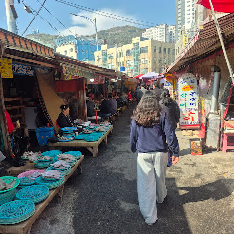 **부산 자갈치 시장 – 해산물 애호가라면 꼭 가봐야 할 곳**<br><br>자갈치 시장은 부산 여행의 하이라이트 중 하나였습니다. 한국 최대 규모의 어시장인 이곳은 활기 넘치는 분위기 속에 신선한 해산물(랍스터, 게, 낙지, 굴 등)이 가득한 노점들로 둘러싸여 있고, 맑고 깨끗한 바닷바람이 불어옵니다.<br>시장 위층에는 갓 잡은 생선을 요리해주는 작은 식당들이 많아 원하는 대로 주문할 수 있습니다. 저는 갓 요리한 낙지를 포함한 모듬 해산물 플래터를 선택했는데, 진한 풍미와 부드러운 살이 일품이었습니다.<br><br>시장은 다소 관광객이 많긴 하지만, 한국의 해산물 문화를 제대로 느끼고, 멋진 사진을 찍고, 오감을 만족시키는 경험을 할 수 있는 곳입니다.<br><br>해산물을 좋아한다면 부산 여행 시 자갈치 시장은 절대 놓쳐서는 안 될 곳입니다.
