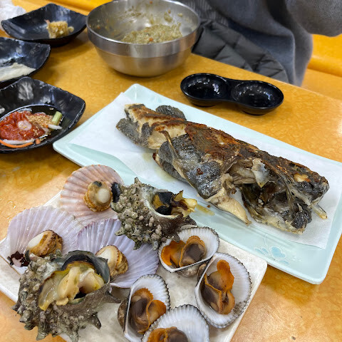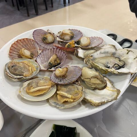 100번 노점에서 식사했어요. 사장님이 가리비랑 굴도 덤으로 주셨어요! 🦪 구운 광어가 정말 맛있었어요! 😋