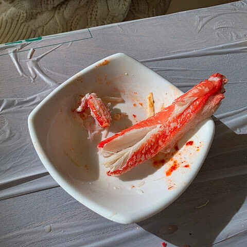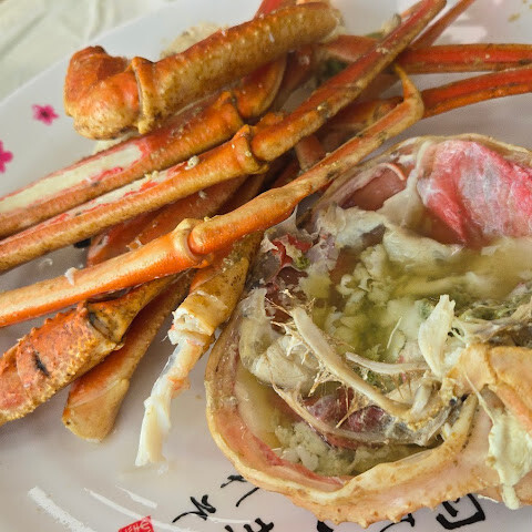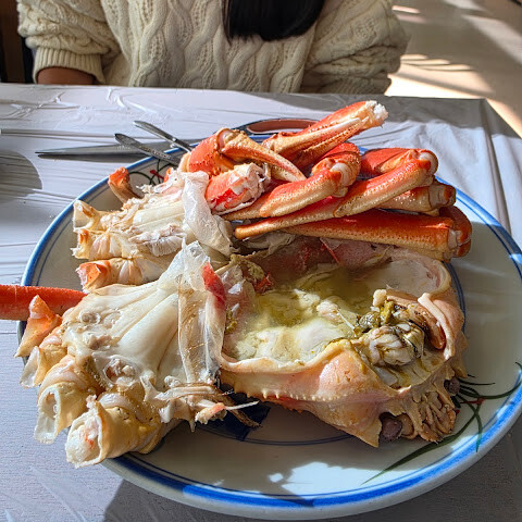 호텔이 바로 근처에 있어서 아침 식사를 하러 갔습니다. 210번 매대에 가서 킹크랩을 먹고 싶었는데, 주인이 인원이 둘뿐이라 킹크랩(2.5kg)을 다 먹지 못할 것 같아서 대게(1.6kg)를 주문하라고 했습니다.