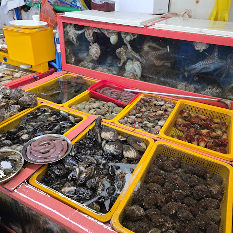 평일 점심시간에 방문했는데, 해산물 종류는 매우 다양했지만 손님은 많지 않았습니다. 시장을 걷다 보면 상인들이 끊임없이 압력을 가해서 조금 스트레스를 받았습니다.