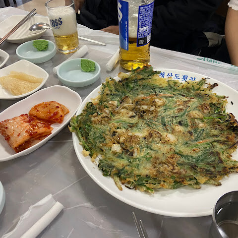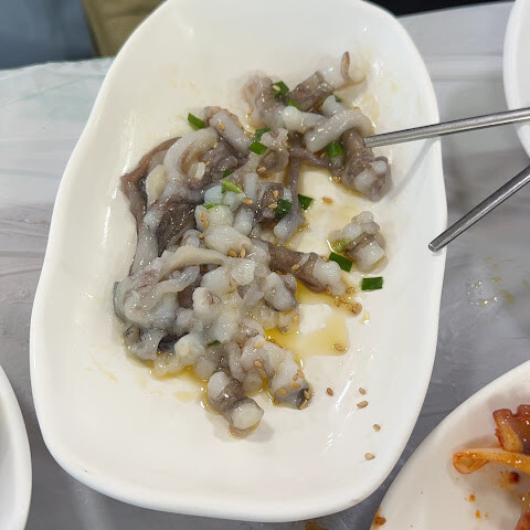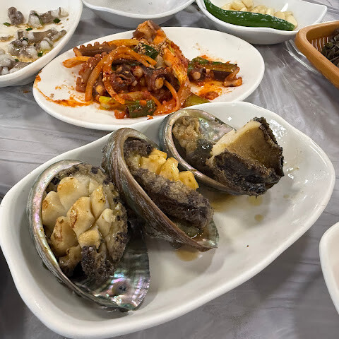 이 부분은 정말 짜증 났어요. 테이블이 아직 준비되지 않은 것 같아서 (주변에 빈 자리가 꽤 많았는데도요???) 한참을 서 있었죠. 5분 정도 기다린 끝에 드디어 자리에 앉았어요. 뭘 원하는지 설명하려고 언어 장벽이 좀 있었지만, 결국 광어 외에도 조개찜, 전복, 문어볶음이 나온다는 걸 알게 됐어요. 요리는 하나씩 천천히 나왔고, 광어 사시미는 꽤 일찍 나왔죠. 그런데 조리된 광어는 나오기까지 시간이 좀 걸렸기 때문에 의아해지기 시작했어요.