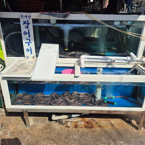 해산물에서 강한 비린내가 났다.<br>100번과 101번 가판대 주인들은 친절했다. 작은 조개류가 더 맛있었고, 큰 조개류는 바닷물과 내장 맛이 강했다. 구운 새우는 괜찮았고, 눈게는 꽤 맛있었다.<br>2층 식사 공간은 평범했고, 1인당 요금과 음식값을 따로 받는다.
