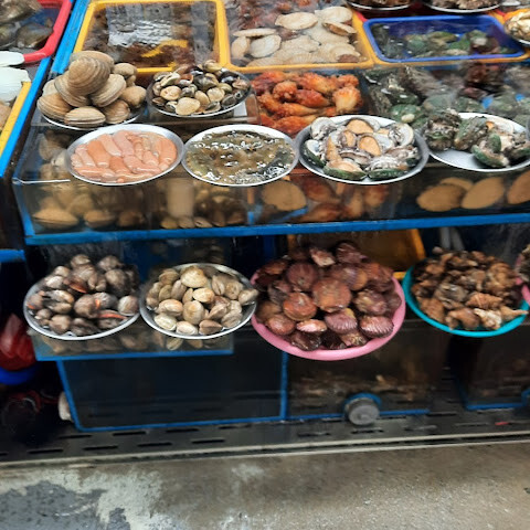여기 오시면 해산물은 꼭 드셔보세요. 1층 전체가 온갖 종류의 해산물을 판매합니다.<br><br>눈게나 왕게를 추천드려요. 눈게는 살짝 달콤한 맛이 나고 왕게는 살짝 짭짤한 맛이 나요. 눈게는 1kg에 약 70,000원, 왕게는 1kg에 약 90,000원입니다.<br><br>해산물을 사 온 후에는 2층 식당으로 가져다 달라고 해서 요리해 먹을 수 있어요. 요리비는 5,000원, 테이블 이용료는 1인당 5,000원입니다. 하지만 음식을 함께 주문하면 테이블 이용료는 보통 면제해 줘요.<br><br>저는 35번 가게에서 먹었는데, 젊은 사장님이 친절하고 한국어, 영어, 중국어까지 할 줄 알아요.<br><br>꼬치고기도 맛있었는데, 가시가 좀 많으니 삼키지 않도록 조심하세요.