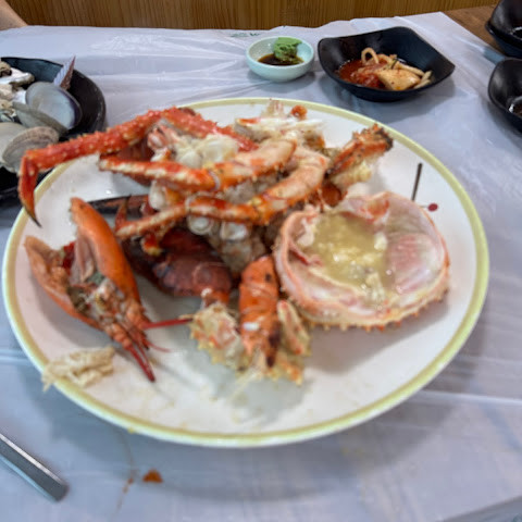 살아있는 왕게는 정말 맛있어요. 3.5kg짜리 왕게에 구운 새우, 가리비, 굴이 함께 나오는데 한국 돈으로 24만 원밖에 안 해요.