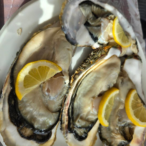 100번 노점에서 식사했어요. 사장님이 가리비랑 굴도 덤으로 주셨어요! 🦪 구운 광어가 정말 맛있었어요! 😋