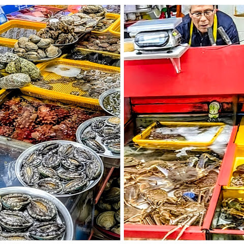 제 친구가 부산에 있는 동안 유명한 수산시장을 경험하고 싶어 했는데, 사실 저는 해산물을 먹지 않지만, 그래도 친구의 도움을 받기 위해 따라갔어요.